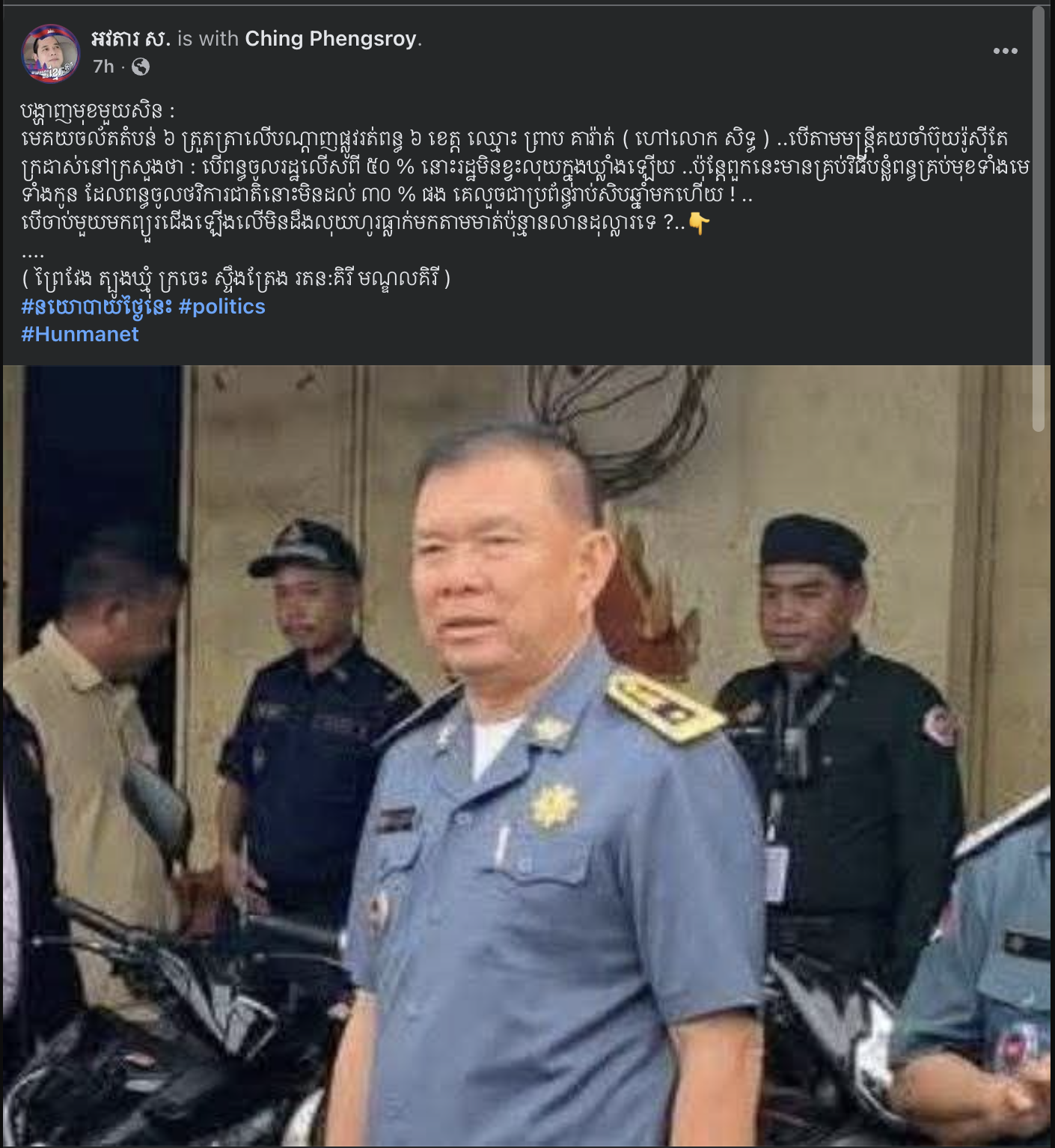 គណនីហ្វេសប៊ុកអវតារ ស. បានបង្ហោះថា មេគយចល័តតំបន់ ៦ ត្រួតត្រាលើបណ្ដាញផ្លូវរត់ពន្ធ ៦ ខេត្ត ឈ្មោះ ព្រាប គារ៉ាត់ ( ហៅលោក សិទ្ធ ) មានគ្រប់វិធីបន្លំពន្ធគ្រប់មុខទាំងមេ ទាំងកូន…
