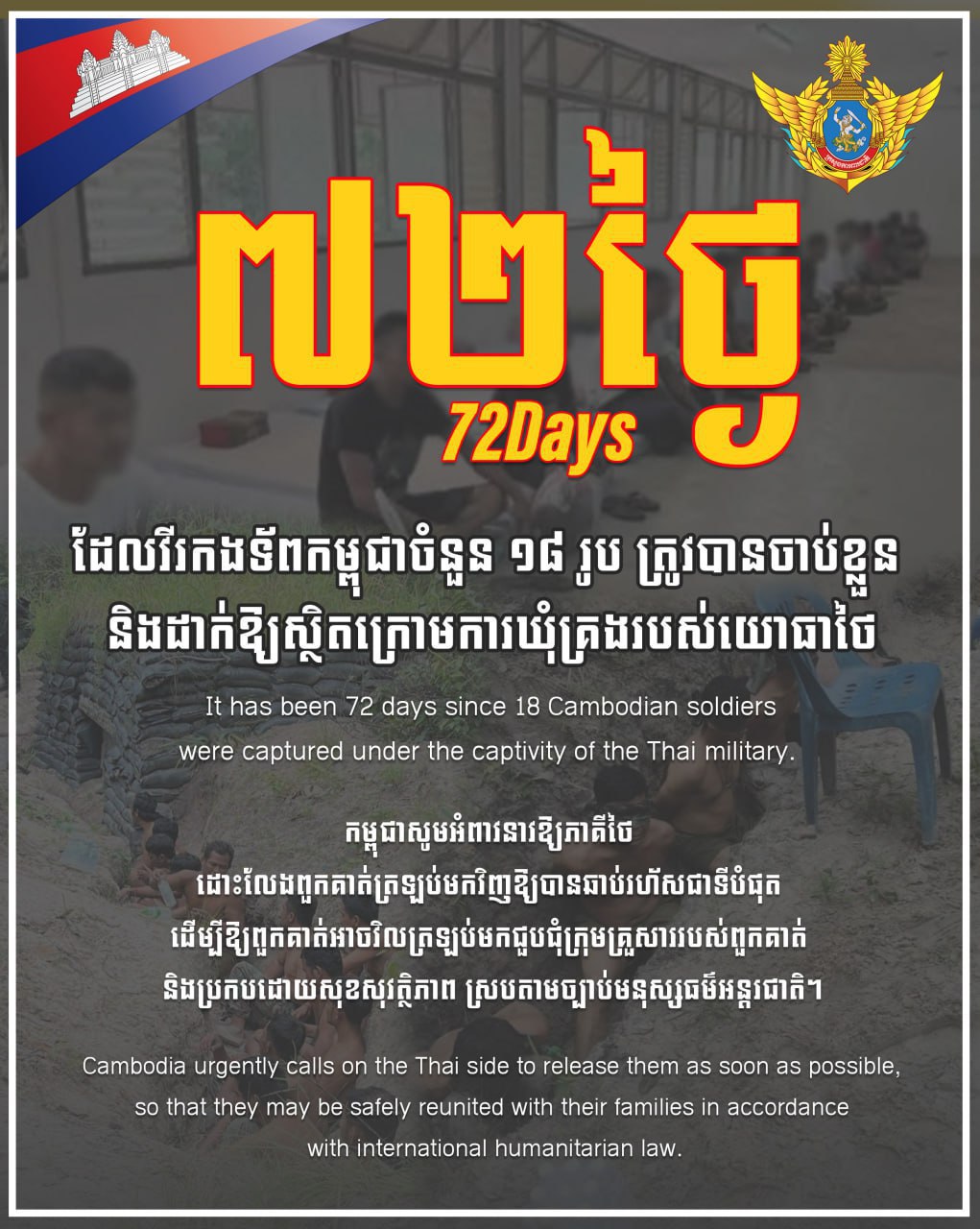 ថ្ងៃនេះជា ថ្ងៃទី៧២ហើយ ដែលវីរកងទ័ពកម្ពុជាចំនួន ១៨រូប ត្រូវបានចាប់ខ្លួន និងដាក់ឱ្យស្ថិតក្រោមការឃុំគ្រងរបស់យោធាថៃ