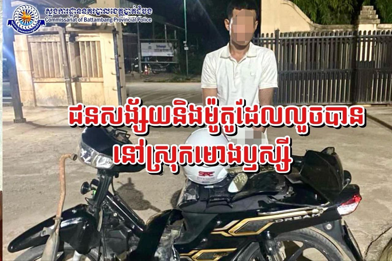 ជនសង័្សយដែលលួចម៉ូតូនោះគឺឈ្មោះ ធី រ៉ាមី ហៅមី ភេទប្រុស អាយុ២៤ឆ្នាំ ដែលសមត្ថកិច្ចនគរបាលស្រុកមោងឫស្សី សហការគ្នាជាមួយសមត្ថកិច្ចនគរបាលស្រុកបាណន់ធ្វើការឃាត់ខ្លួនពីថ្ងៃទី៥ ខែ តុលា ឆ្នាំ ២០២៥ ពីរឿងលួចកាច់សោកម៉ូតូបញ្ជូនទៅតុលាការរួចហើយ ឯម៉ូតូដែលលួចបាននៅស្រុកគាស់ក្រឡនេះ បានយកទៅឱ្យបុរសទាំង២នាក់ខាងលើ ចាត់ចែងថែរក្សាទុកដោយ ស្ងៀមស្ងាត់បំផុតតាំងពីថ្ងៃទី១៤ ខែសីហាឆ្នាំ២០២៥។