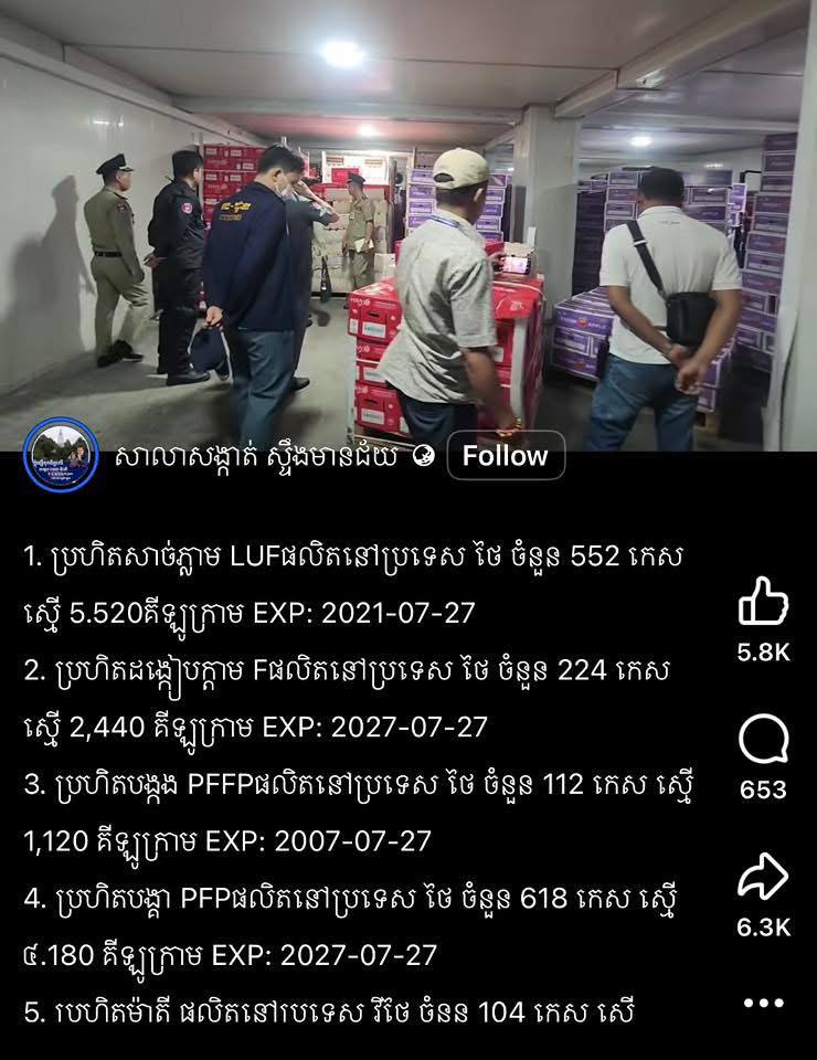 (ភ្នំពេញ)៖ ក្នុងរយៈពេលប៉ុន្មានថ្ងៃចុងក្រោយនេះ អ្នកប្រើប្រាស់បណ្តាញទំនាក់ទំនងសង្គម និងសារព័ត៌មានមួយចំនួន បានផ្ទុះការចាប់អារម្មណ៍យ៉ាងខ្លាំង ចំពោះប្រភពព័ត៌មាន ដែលផ្សព្វផ្សាយលើ Page Facebook ផ្លូវការរបស់ «សាលាសង្កាត់ ស្ទឹងមានជ័យ» អំពីប្រតិបត្តិការរបស់កម្លាំងគយ និងរដ្ឋាករកម្ពុជា ជាមួយសមត្ថកិច្ចពាក់ព័ន្ធ ចុះពិនិត្យអនុលោមភាពពន្ធ ដោយឆែកឃ្លាំងស្តុកទំនិញប្រហិត និងផ្លែឈើមួយកន្លែង ក្នុងស្ថិតលើផ្លូវ៣៨សេ ភូមិទ្រាសង្កាត់ ស្ទឹងមានជ័យទី១ ខណ្ឌមានជ័យ រាជធានីភ្នំពេញ កាលពីរសៀលថ្ងៃទី៤ ខែតុលា ឆ្នាំ២០២៥។