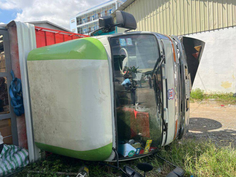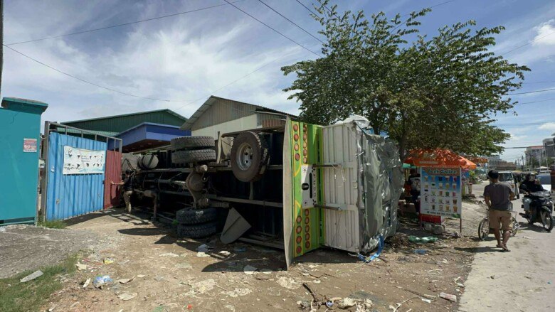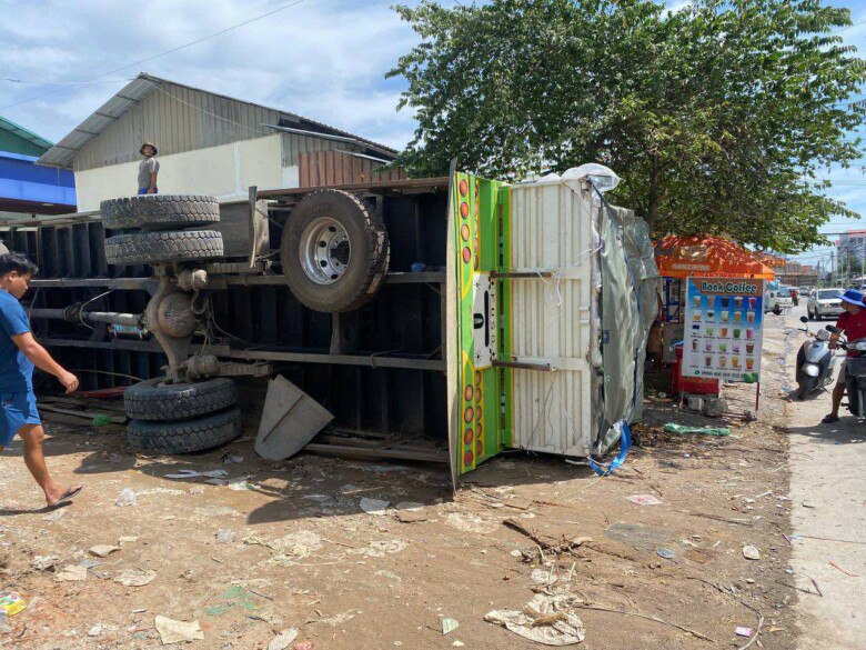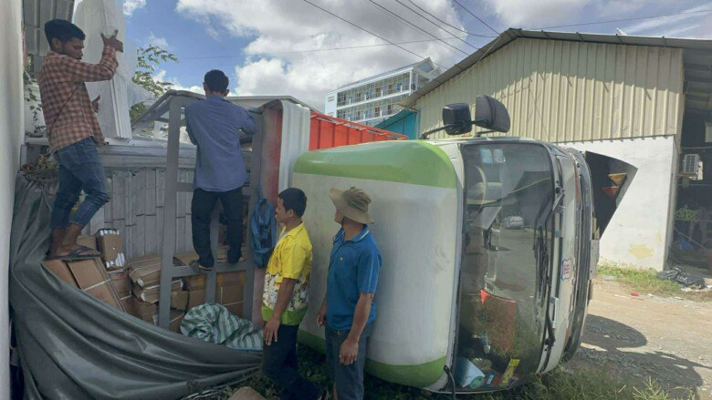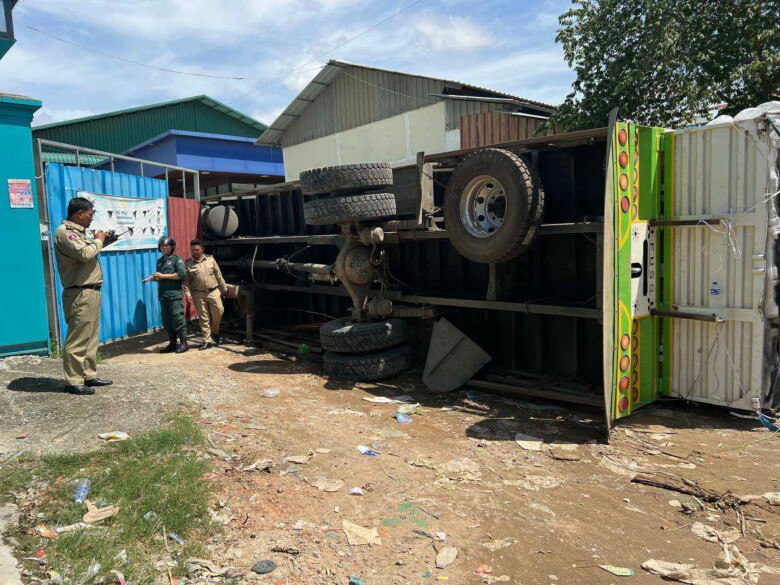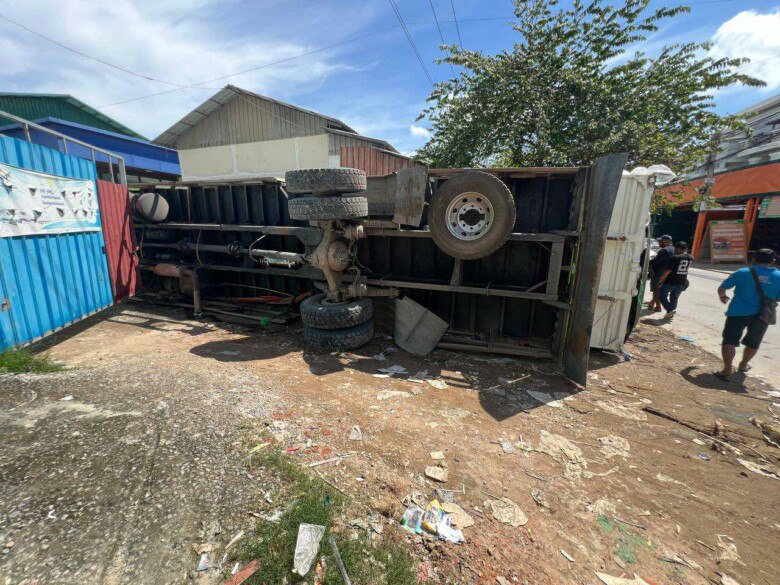 រថយន្តធុនធំដឹកទំនិញ១គ្រឿង ខណៈបេីកចូលទៅក្នុងឃ្លាំងមួយកន្លែង ដើម្បីទម្លាក់ទំនិញចុះស្តុកទុកក្នុងឃ្លាំងហើយពុំដឹងថាមានបញ្ហាអ្វីទេ ស្រាប់តែក្រឡាប់សង្កត់លេីផ្ទះមួយនៅជិតឃ្លាំង