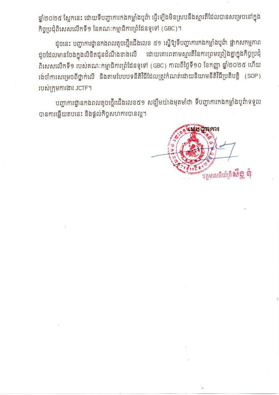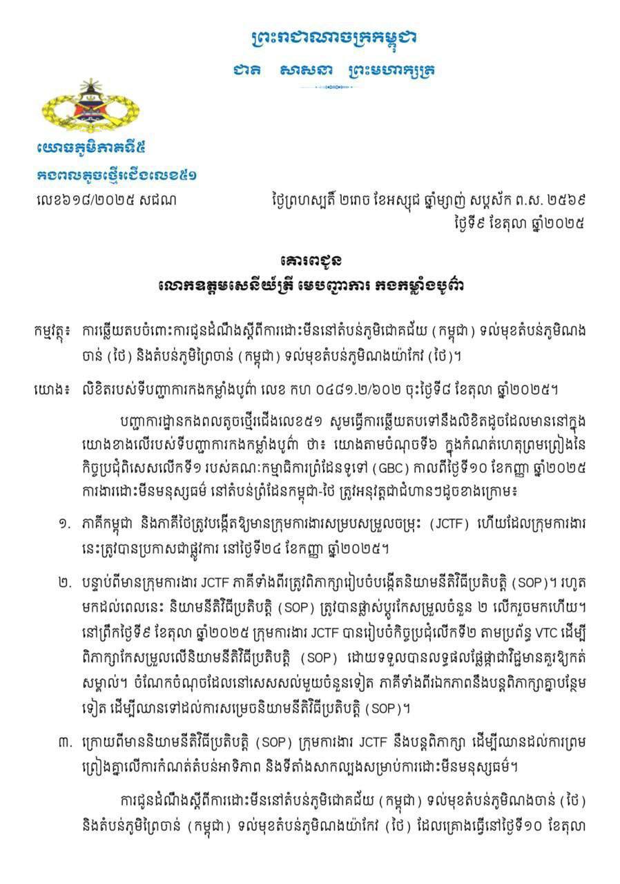 The Ministry of National Defence of the Kingdom of Cambodia wishes to inform the public, both domestic and international media outlets, of the following: On Thursday, October 9, 2025, the 51st Infantry Brigade of the Royal Cambodian Armed Forces’ 5th Military Region issued a letter in response to a demining notification issued by the Burapha Task Force of the Thai 1st Army Area. This notification concerned the demining of the Chok Chey Village area (Cambodia) opposite the Nong Chan Village area (Thailand), and the Prey Chan Village area (Cambodia) opposite the Nong Ya Kaeo Village area (Thailand). The content of the response is as follows: