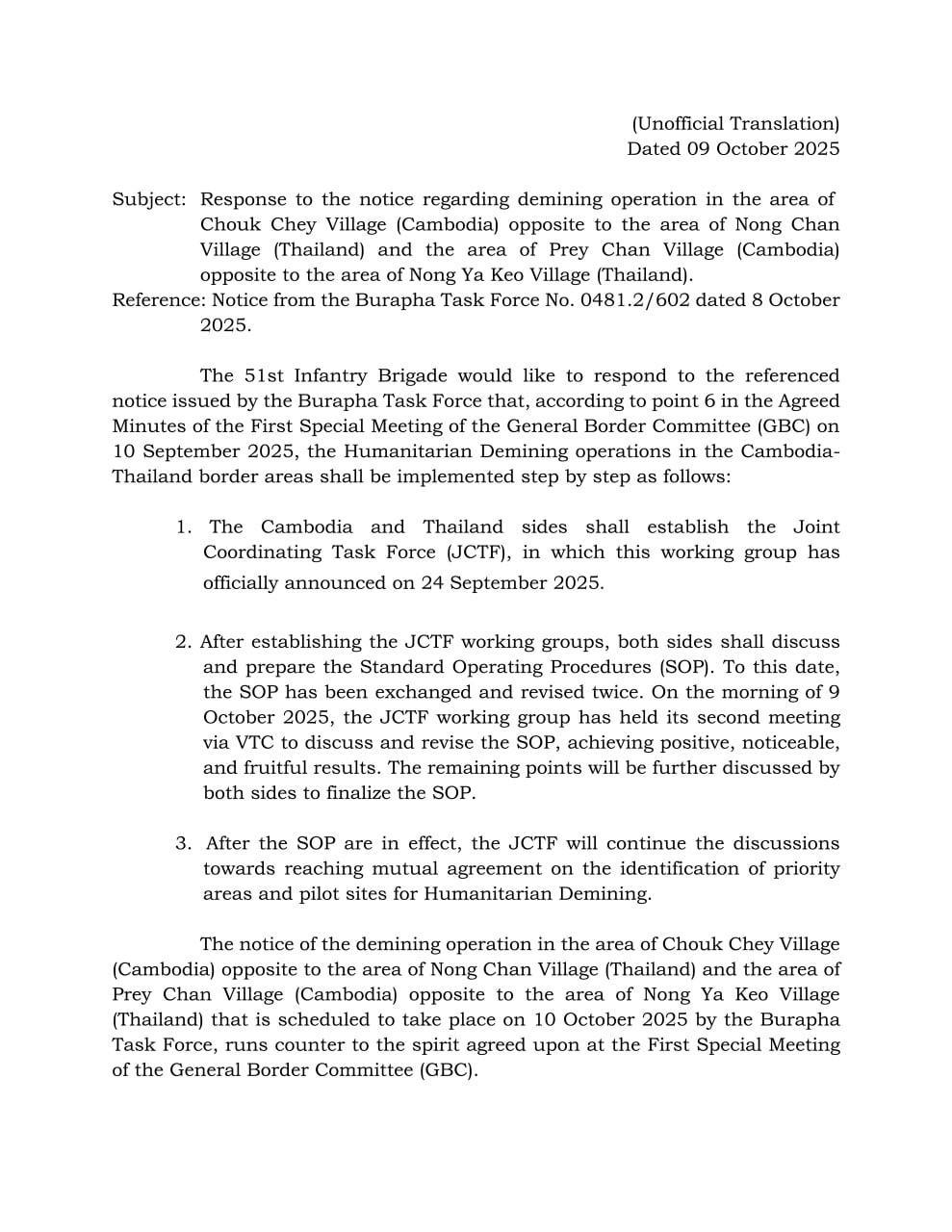 នៅថ្ងៃព្រហស្បតិ៍ ទី៩ ខែតុលា ឆ្នាំ២០២៥ កងពលតូចថ្មើរជើងលេខ៥១ នៃយោធភូមិភាគទី៥ បានផ្ញើលិខិតឆ្លើយតបនឹងសេចក្តីជូនដំណឹងស្តីពីការដោះមីននៅតំបន់ភូមិជោគជ័យ (កម្ពុជា) ទល់មុខនឹងតំបន់ភូមិណងចាន់ (ថៃ) និងតំបន់ភូមិព្រៃចាន់ (កម្ពុជា) ទល់មុខនឹងតំបន់ភូមិណងយ៉ាកែវ (ថៃ) របស់ កងកម្លាំងបូព៌ា នៃកងទ័ពភូមិភាគទី១ ថៃ ដែលមានខ្លឹមសារដូចខាងក្រោម៖