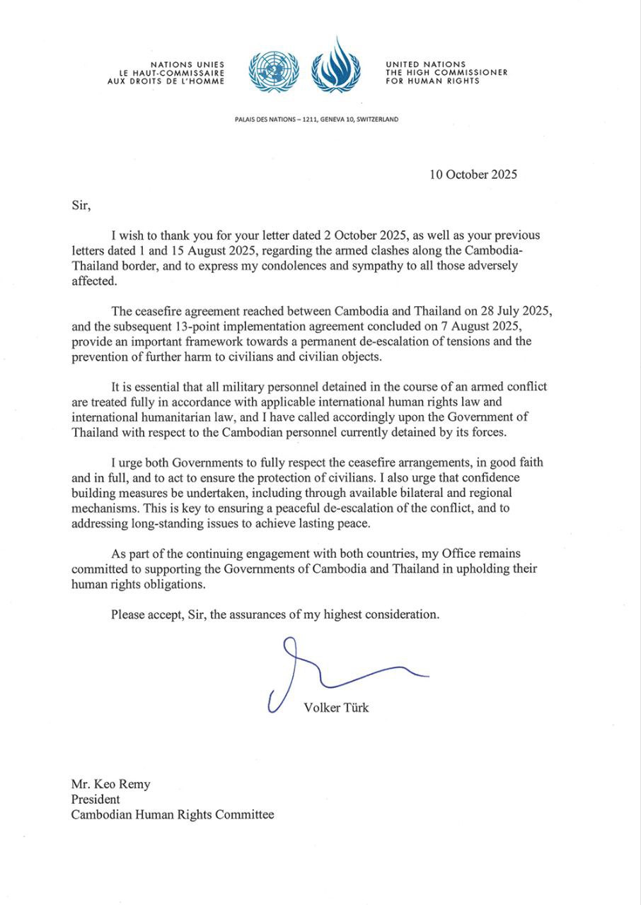 ឧត្តមស្នងការ នៃការិយាល័យឧត្តមស្នងការ UN ទទួលបន្ទុកសិទ្ធិមនុស្ស ឆ្លើយតបនឹងញត្តិបន្ទាន់របស់កម្ពុជា ពាក់ព័ន្ធកងទ័ពទាំង១៨រូប ដែលស្ថិតនៅជាប់ឃុំឃាំងរបស់ថៃ