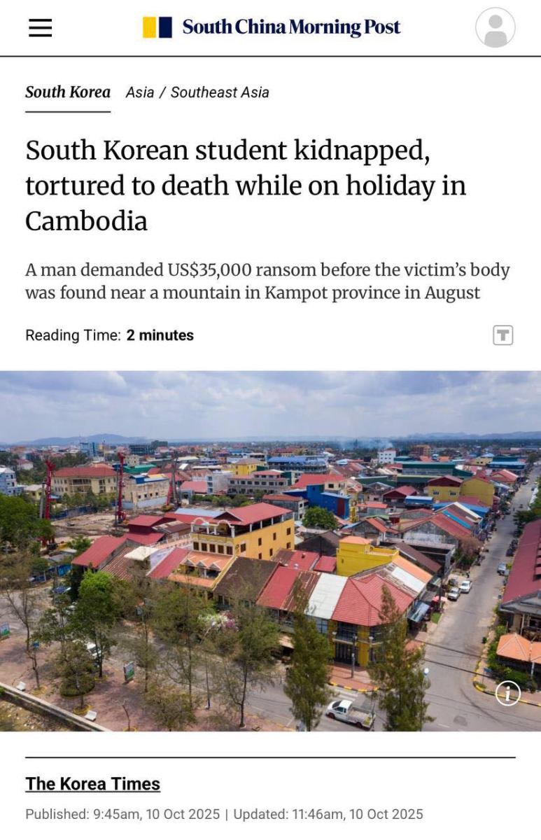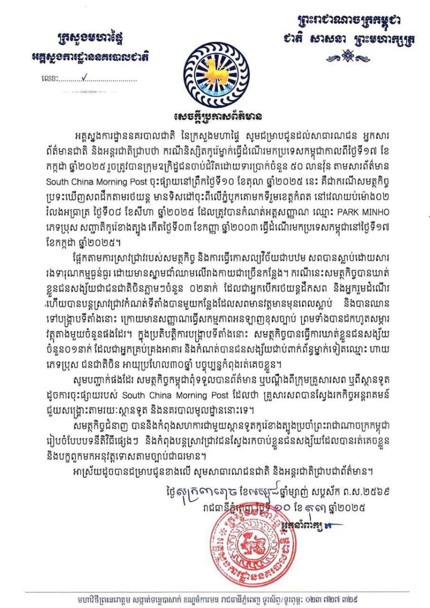 អគ្គស្នងការដ្ឋាននគរបាលជាតិ នៃក្រសួងមហាផ្ទៃ នៅថ្ងៃទី១០ ខែតុលា ឆ្នាំ២០២៥ នេះ បានចេញសេចក្ដីប្រកាសព័ត៌មាន បានឱ្យដឹងថា ករណីនិស្សិតកូរ៉េម្នាក់ធ្វើដំណើរមកប្រទេសកម្ពុជាកាលពីថ្ងៃទី១៧ ខែកក្កដា ឆ្នាំ២០២៥ រួចត្រូវបានក្រុមឧក្រិដ្ឋជនចាប់ជំរិតដោយទារប្រាក់ចំនួន ៥០ លានវ៉ុន តាមសារព័ត៌មាន South China Morning Post ចុះផ្សាយនៅព្រឹកថ្ងៃទី១០ ខែតុលា ឆ្នាំ២០២៥ នេះ គឺជាករណីសមត្ថកិច្ច ប្រទះឃើញសពដឹកតាមរថយន្ត មានទិសដៅចុះពីលើភ្នំបូកគោមកទីរួមខេត្តកំពត នៅវេលាយប់ម៉ោង០២ រំលងអធ្រាត្រ ថ្ងៃទី០៨ ខែសីហា ឆ្នាំ២០២៥ ដែលត្រូវបានកំណត់អត្តសញ្ញាណ ឈ្មោះ PARK MINHO ភេទប្រុស សញ្ជាតិកូរ៉េខាងត្បូង កើតថ្ងៃទី០៣ ខែកញ្ញា ឆ្នាំ២០០៣ ធ្វើដំណើរមកប្រទេសកម្ពុជានៅថ្ងៃទី១៧ ខែកក្កដា ឆ្នាំ២០២៥។