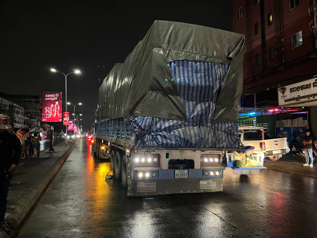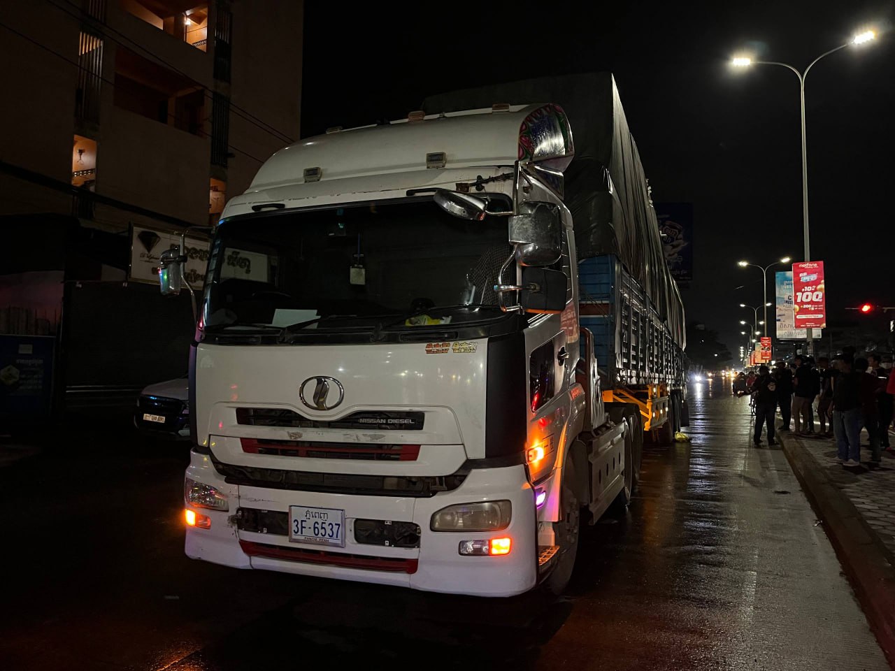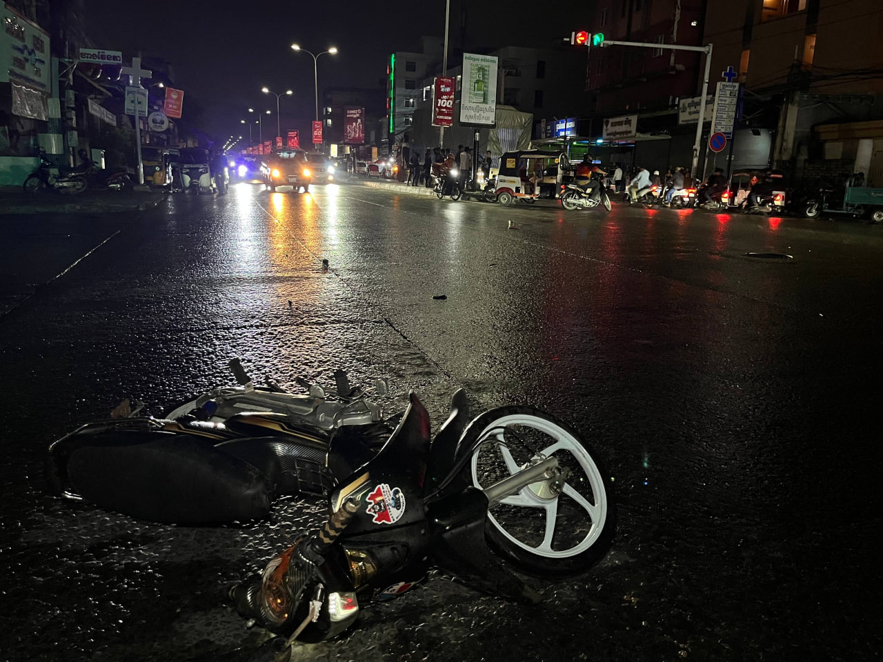 ប្រភពព័ត៌មានបានបញ្ជាក់ថា លុះមកដល់ចំណុចកើតហេតុ រថយន្តក៏បត់ឆ្វេងឆ្លងទៅផ្លូវចោមចៅ ឡើងបានពាក់កណ្តាលផ្លូវ ក៏ភាគីខាងម៉ូតូចាប់ហ្វ្រាំងមិនទាន់ ស្របពេលផ្លូវមានភ្លៀងរអិល ក៏ដួលម៉ូតូអូសចូលក្រោមកង់រថយន្តកុងតីន័រតែម្តង ខណ:ម្នាក់បានខ្ទាតចេញក្រៅ និងម្នាក់ទៀតខ្ទាតចូលទៅក្រោមកង់ ត្រូវបានរថយន្តកិនអូសជាច្រើនម៉ែត្រ បណ្តាលឲ្យស្លាប់ និងដាច់ជើង ។ យុវជនម្នាក់ទៀត ត្រូវបានរថយន្តសាម៉ុយ បញ្ជូនទៅកាន់មន្ទីរពេទ្យ ក្រោយរងរបួសធ្ងន់ ។ (ក្នុងនោះតៃកុងរថយន្តបានគេចខ្លួនបាត់)