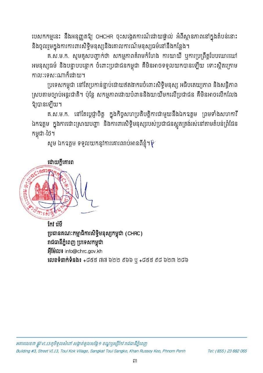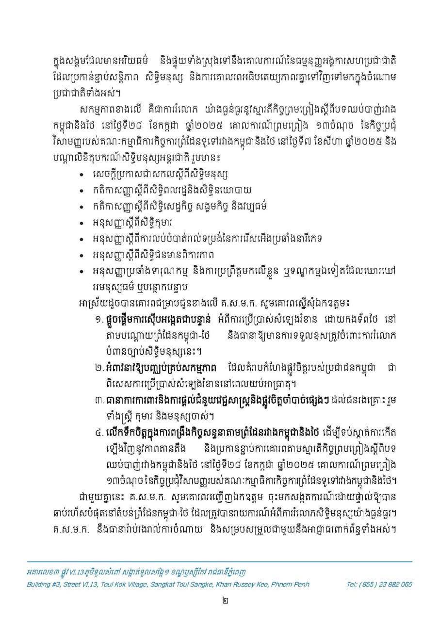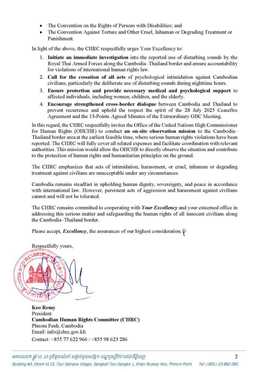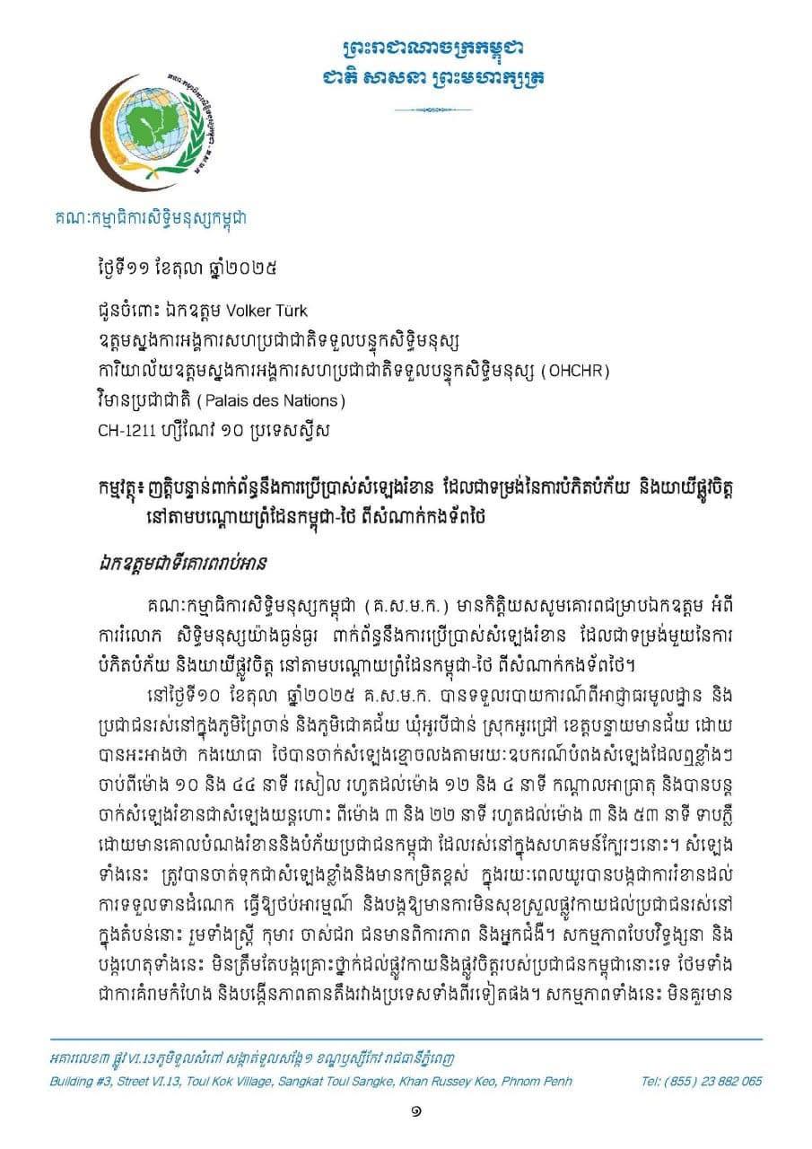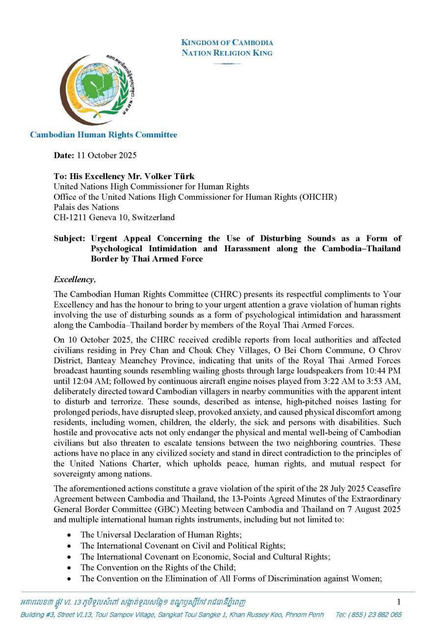 គណៈកម្មាធិការសិទ្ធិមនុស្សកម្ពុជា ផ្ញើញត្តិបន្ទាន់ជូន ឯកឧត្តម Volker Türk ឧត្តមស្នងការអង្គការសហប្រជាជាតិទទួលបន្ទុកសិទ្ធិមនុស្ស (OHCHR) ពាក់ព័ន្ធនឹងការប្រើប្រាស់សំឡេងរំខាន ដែលជាទម្រង់នៃការបំភិតបំភ័យ និងយាយីផ្លូវចិត្ត នៅតាមបណ្តោយព្រំដែនកម្ពុជា-ថៃ ភូមិព្រៃចាន់ និងភូមិជោគជ័យ ឃុំអូរបីជាន់ ស្រុកអូរជ្រៅ ខេត្តបន្ទាយមានជ័យ កាលពីយប់ថ្ងៃទី១០ ខែតុលា ឆ្នាំ២០២៥ ពីសំណាក់កងទ័ពថៃ។
