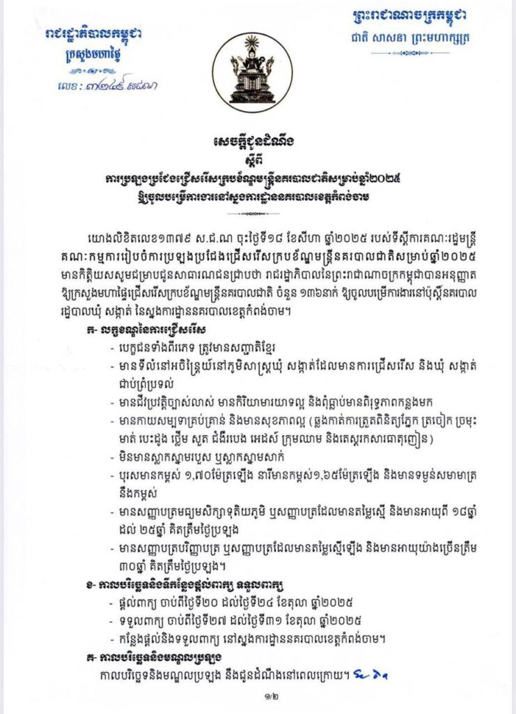 សេចក្តីជូនដំណឹង ស្តីពី ការប្រឡងប្រជែងជ្រើសរើសក្របខ័ណ្ឌមន្ត្រីនគរបាលជាតិ សម្រាប់ឆ្នាំ២០២៥ ឱ្យចូលបម្រើការងារនៅស្នងការដ្ឋាននគរបាលកំពង់ចាម