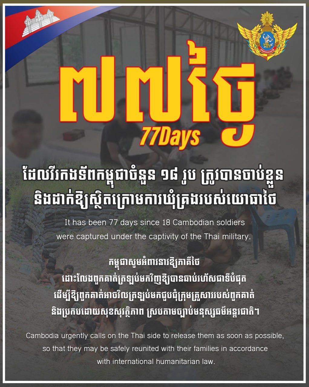 ថ្ងៃនេះជា ថ្ងៃទី៧៧ហើយ ដែលវីរកងទ័ពកម្ពុជាចំនួន ១៨រូប ត្រូវបានចាប់ខ្លួន និងដាក់ឱ្យស្ថិតក្រោមការឃុំគ្រងរបស់យោធាថៃ
