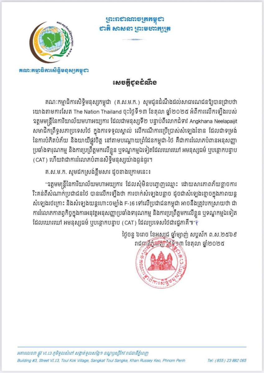 តាមសេចក្ដីជូនដំណឹងរបស់ គណៈកម្មាធិការសិទ្ធិមនុស្សកម្ពុជា (គ.ស.ម.ក.) បានឱ្យដឹងថា យោងតាមកាសែត Khaosod English ចុះថ្ងៃទី១៤ ខែតុលា ឆ្នាំ២០២៥ អំពីការលើកឡើងរបស់ លោក Kannavee Suebsaeng ប្រធានគណបក្សយុត្តិធម៌ និងលោក Natthapong Nat Ruangpanywauth ប្រធានគណបក្សប្រជាជន លើករណីការប្រើប្រាស់សំឡេងរំខាន ដែលជាទម្រង់នៃការបំភិតបំភ័យ និង យាយីផ្លូវចិត្តប្រជាជនកម្ពុជា នៅតាមបណ្តោយព្រំដែនកម្ពុជា-ថៃ គឺជាការរំលោភសិទ្ធិមនុស្ស និងច្បាប់ អន្តរជាតិយ៉ាងធ្ងន់ធ្ងរ។