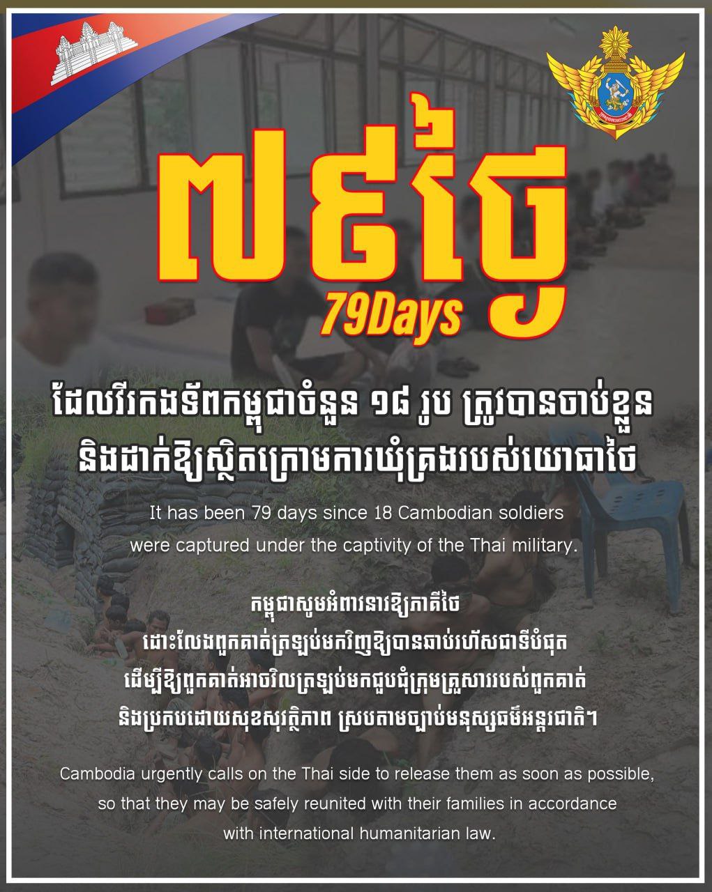 ថ្ងៃនេះជា ថ្ងៃទី៧៩ហើយ ដែលវីរកងទ័ពកម្ពុជាចំនួន ១៨រូប ត្រូវបានចាប់ខ្លួន និងដាក់ឱ្យស្ថិតក្រោមការឃុំគ្រងរបស់យោធាថៃ