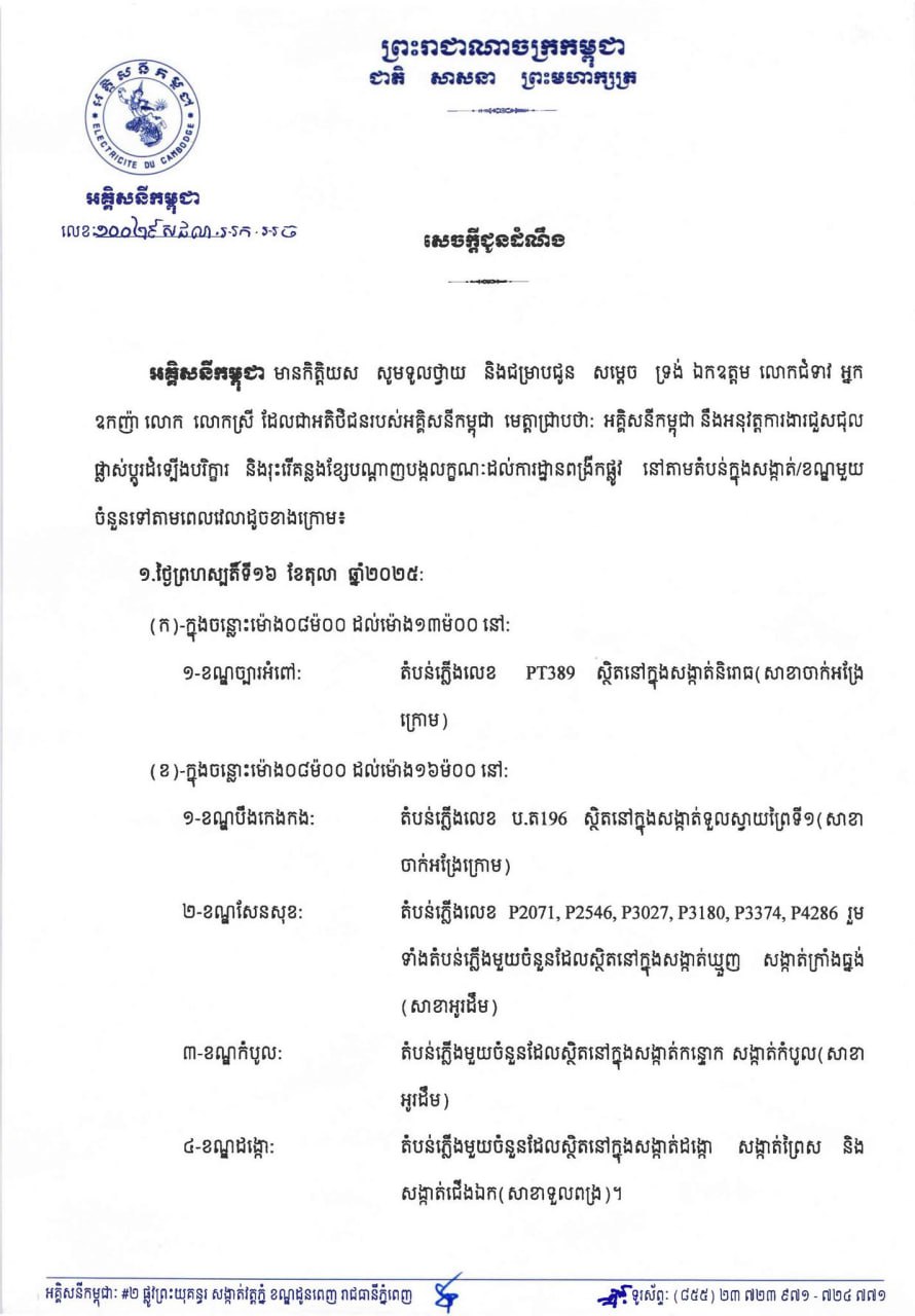 (ភ្នំពេញ)៖ អគ្គិសនីកម្ពុជា (EDC) បានចេញសេចក្តីជូនដំណឹង ស្តីពីការអនុវត្តការងារជួសជុល ផ្លាស់ប្តូរដំឡើងបរិក្ខារនានា និងរុះរើគន្លងខ្សែបណ្តាញ អគ្គិសនីរបស់អគ្គិសនីកម្ពុជា ដើម្បីបង្កលក្ខណៈងាយស្រួលដល់ការដ្ឋានពង្រីកផ្លូវ នៅថ្ងៃទី១៦ ខែតុលា ឆ្នាំ២០២៥ ដល់ថ្ងៃទី១៩ ខែតុលា ឆ្នាំ២០២៥ នៅតំបន់មួយចំនួនទៅតាមពេលវេលា និងទីកន្លែងដូចសេចក្តីជូនដំណឹងលម្អិតខាងក្រោម។