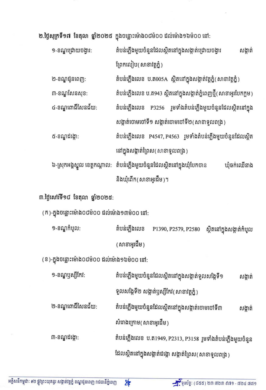 EDC ជូនដំណឹងពីការរអាក់រអួលចរន្តតាមតំបន់សង្កាត់ ខណ្ឌមួយចំនួនចាប់ពីថ្ងៃនេះ ដល់ថ្ងៃទី១៩ ខែតុលា ដើម្បីរុះរើគន្លងខ្សែបណ្តាញ ផ្លាស់ប្តូរ តម្លើងបរិក្ខារងាយស្រួលដល់ការដ្ឋានពង្រីកផ្លូវ