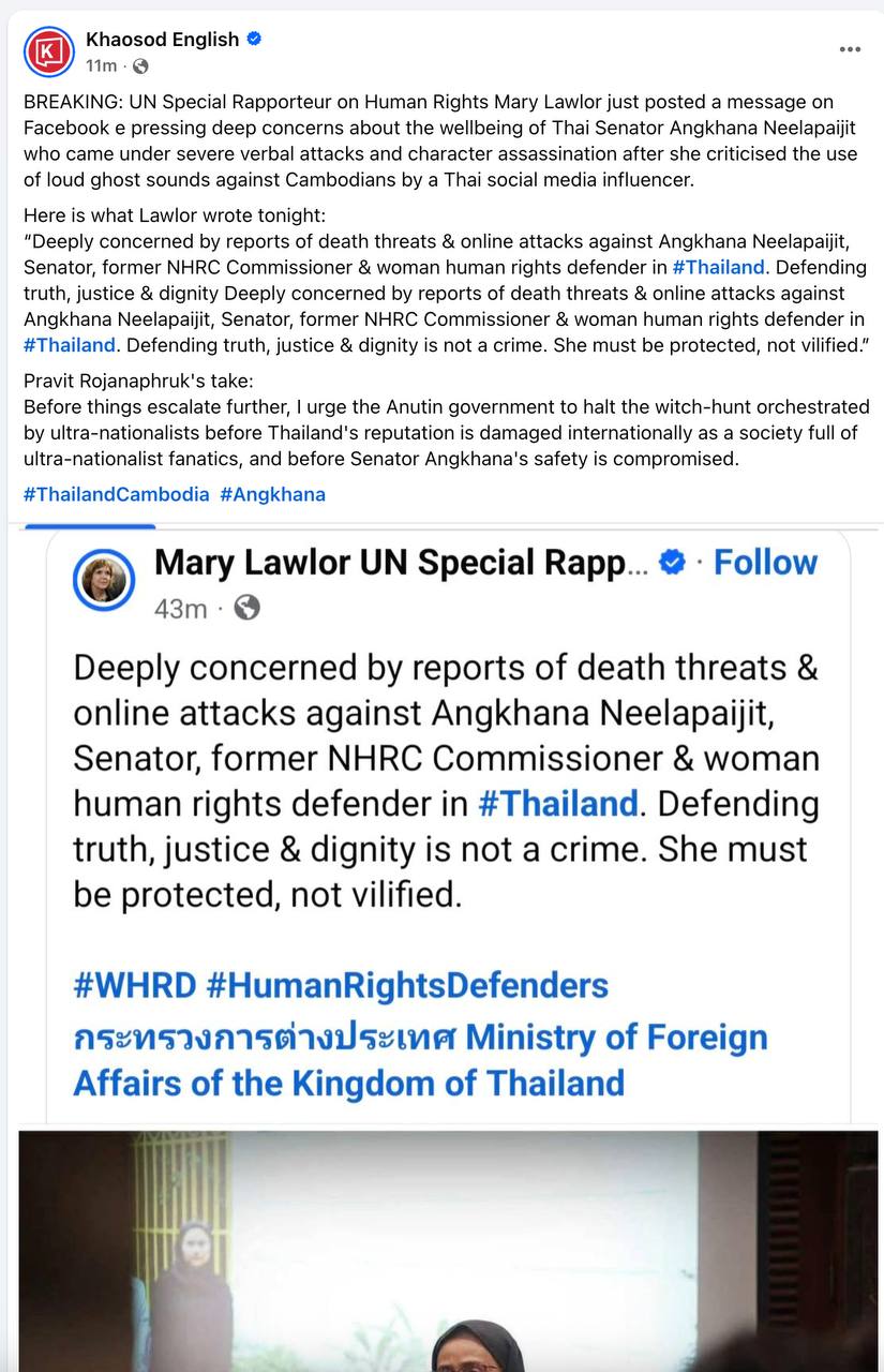 (បាងកក, ថៃ)៖ អ្នករាយការណ៍ពិសេសរបស់អង្គការសហប្រជាជាតិ លោកស្រី ម៉ារី ឡាវល័រ (Mary Lawlor) បានសម្តែងនូវក្តីបារម្ភយ៉ាងខ្លាំងចំពោះសេចក្តីរាយការណ៍អំពីការគំរាមសម្លាប់ និងការវាយប្រហារតាមអនឡាញ ដែលកំពុងកើតមានឡើងប្រឆាំងនឹងលោកស្រី អាំងខណា នីឡាផៃចិត្រ (Angkhana Neelapaijit) ដែលជាសមាជិកព្រឹទ្ធសភាថៃ ក្រោយពេលលោកស្រីបានចេញប្រឆាំងការចាក់សំឡេងរំខានប្រជាពលរដ្ឋខ្មែរនៅភូមិជោគជ័យ និងភូមិព្រៃចាន់ ពីសំណាក់ក្រុមជ្រុលនិយម ក្រោមការគាំទ្ររបស់យោធា និងអាជ្ញាធរខេត្តស្រះកែវ។ នេះបើតាមការបង្ហោះនៅលើបណ្តាញសង្គម X របស់លោកស្រីផ្ទាល់ នៅថ្ងៃពុធ ទី១៥ ខែតុលា ឆ្នាំ២០២៥។