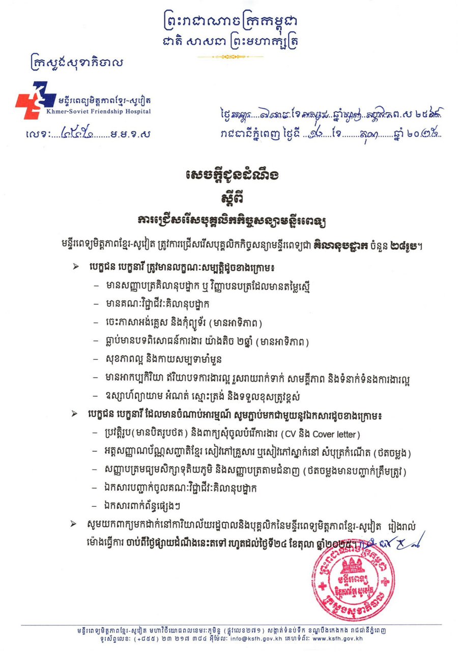 មន្ទីរពេទ្យមិត្តភាពខ្មែរ-សូវៀត ប្រកាសរើសបុគ្គលិកកិច្ចសន្យា ៧ ឯកទេស ផុតកំណត់ឆាប់ៗនេះ