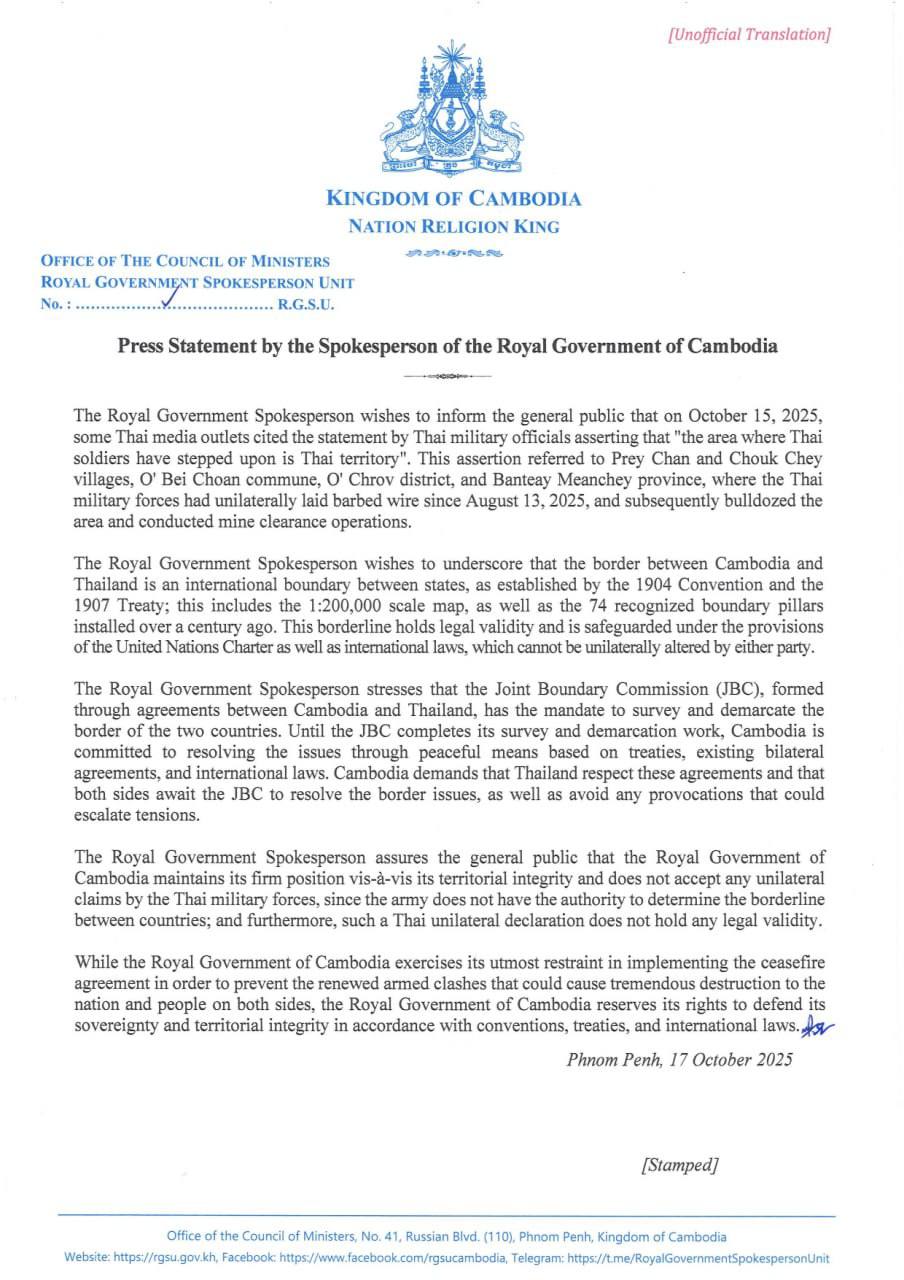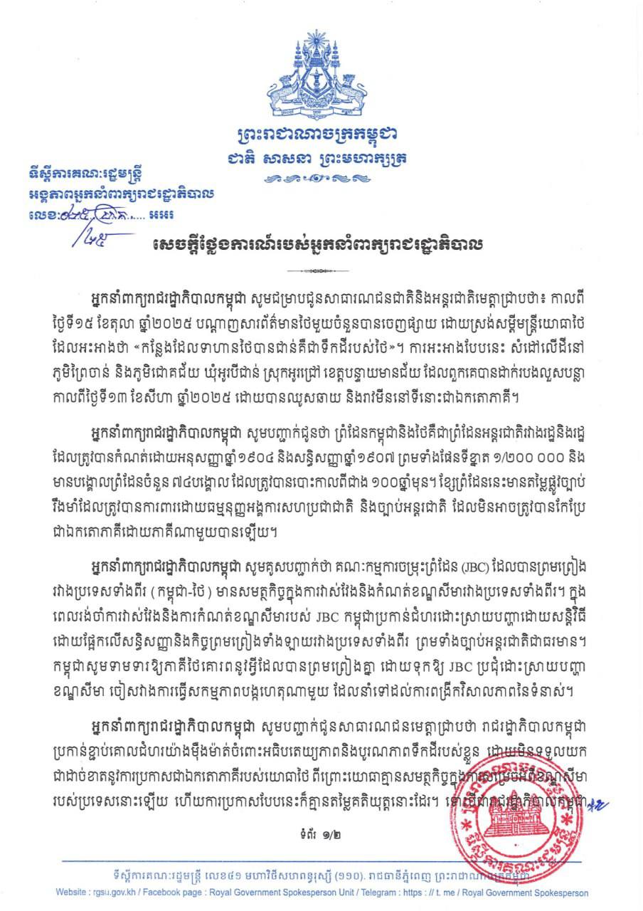 អ្នកនាំពាក្យរាជរដ្ឋាភិបាលកម្ពុជា៖ រាជរដ្ឋាភិបាលកម្ពុជាប្រកាន់ខ្ជាប់គោលជំហរយ៉ាងម៉ឺងម៉ាត់ចំពោះអធិបតេយ្យភាពនិងបូរណភាពទឹកដីរបស់ខ្លួន ដោយមិនទទួលយកជាដាច់ខាតនូវការអះអាងជាឯកតោភាគីរបស់យោធាថៃដែលថា «កន្លែងដែលទាហានថៃបានជាន់គឺជាទឹកដីរបស់ថៃ» ដោយចាត់ទុកការអះអាងនេះថា គ្មានតម្លៃគតិយុត្តនោះឡើយ ហើយកម្ពុជារក្សាសិទ្ធិក្នុងការទាមទារដែនអធិបតេយ្យភាពនិងបូរណភាពទឹកដីរបស់ខ្លួនស្របតាមអនុសញ្ញា សិទ្ធិសញ្ញា និងច្បាប់អន្តរជាតិជាធរមាន។