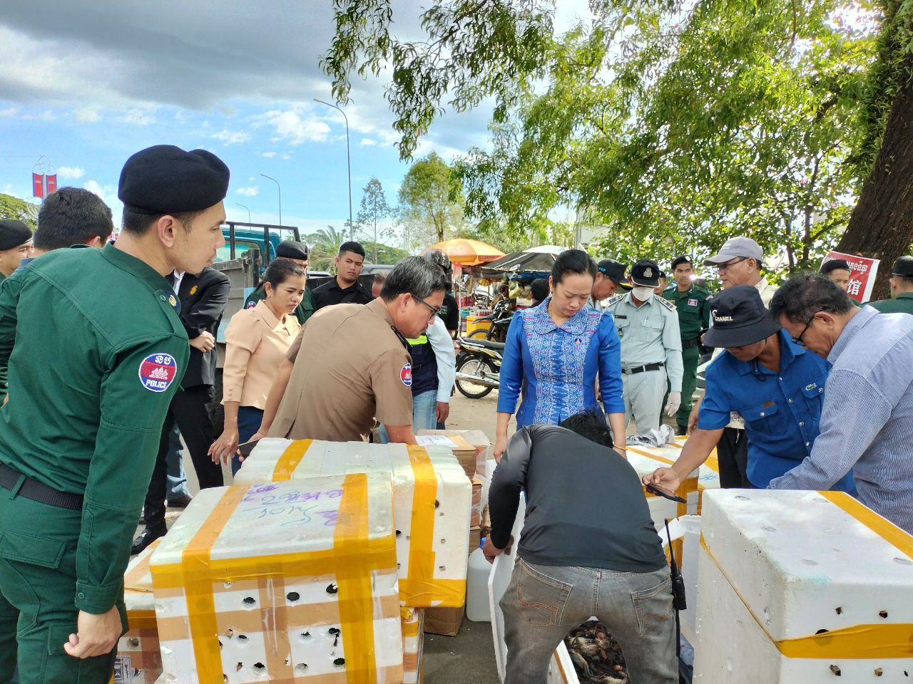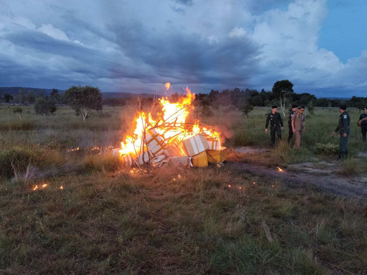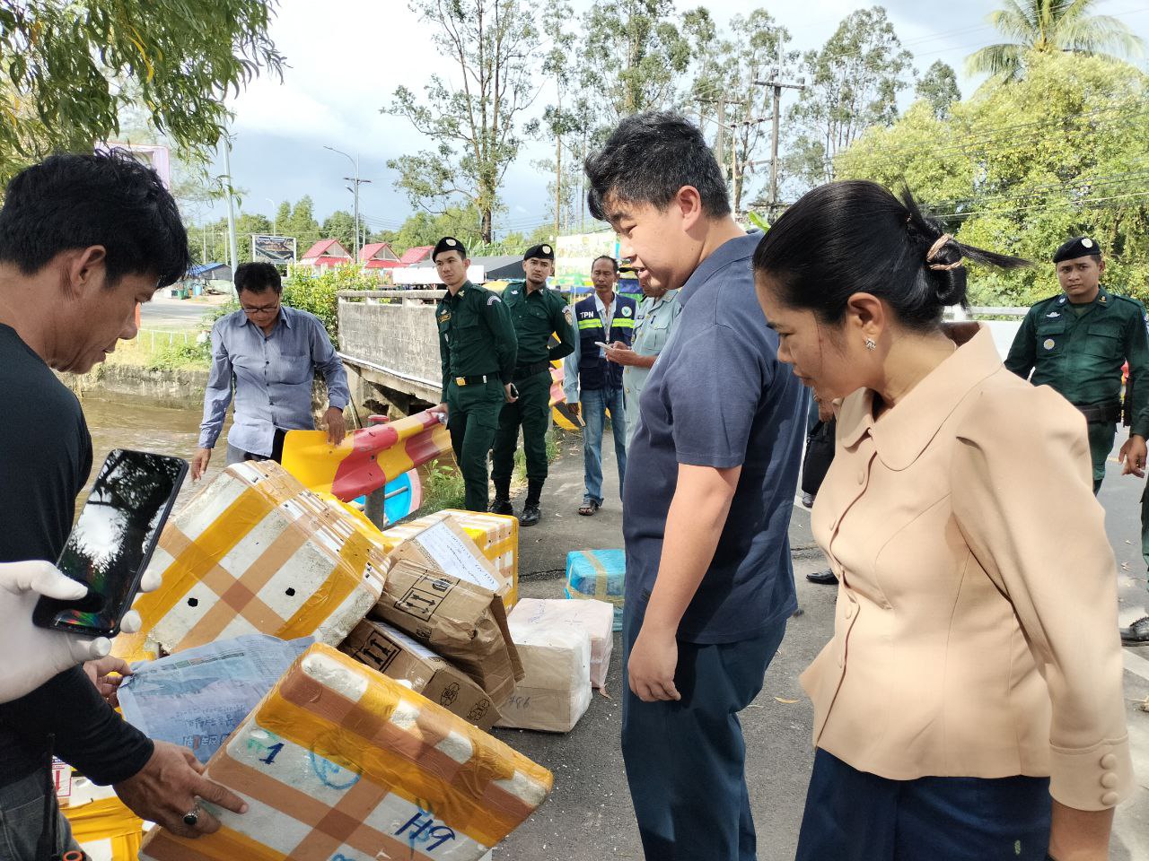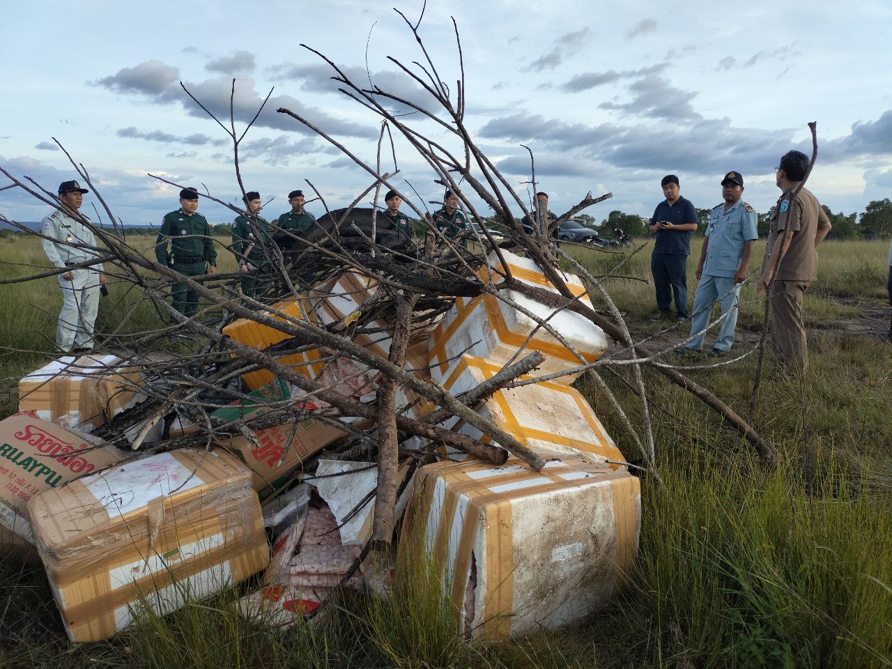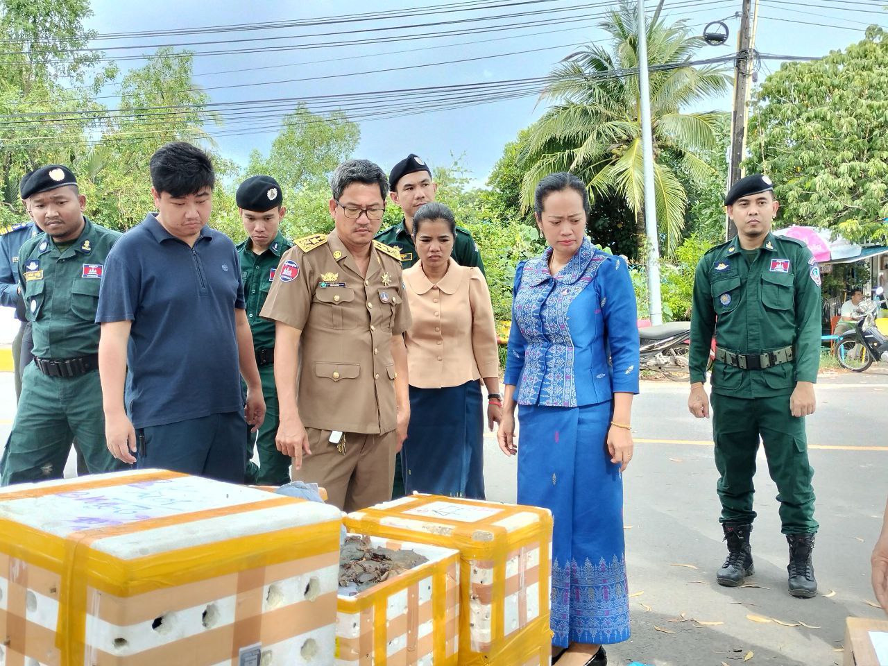 ក្នុងនោះសមត្ថកិច្ចរកឃើញមានក្តាមសកចំនួន២៩កេសតូចធំ ក្តាមបង្កក៥កេស ជើងមាន់បង្កក១២កេស ស្មើនឹងទម្ងន់សរុបជាង១តោន។ ក្រៅពីនេះ ថ្នាំលាបពណ៌កំប៉ុង ថ្នាំសារធាតុប្រតិកម្មអាស៊ីត កាហ្វេកញ្ចប់ ស្លឹកកាធម ស្រោមដៃក្រណាត់ និងសំបកដបទឹក។ ជាក់ស្តែង ទំនិញបង្កកត្រូវបានដុតកម្ទេចចោល រីឯក្តាមសក បញ្ចូនទៅលែងឲ្យរស់រានមានជីវិតនៅសហគមន៍ព្រៃកោងកាង ក្នុងឃុំពាមក្រសោប ស្រុកមណ្ឌលសីមា។