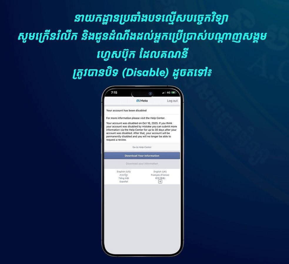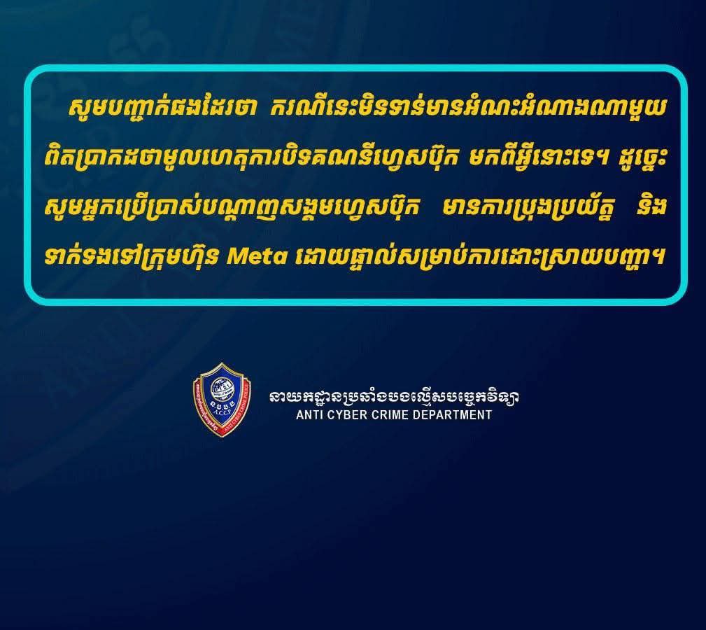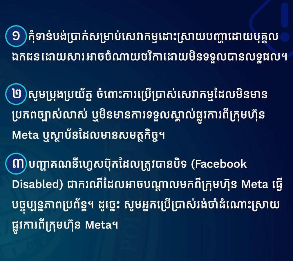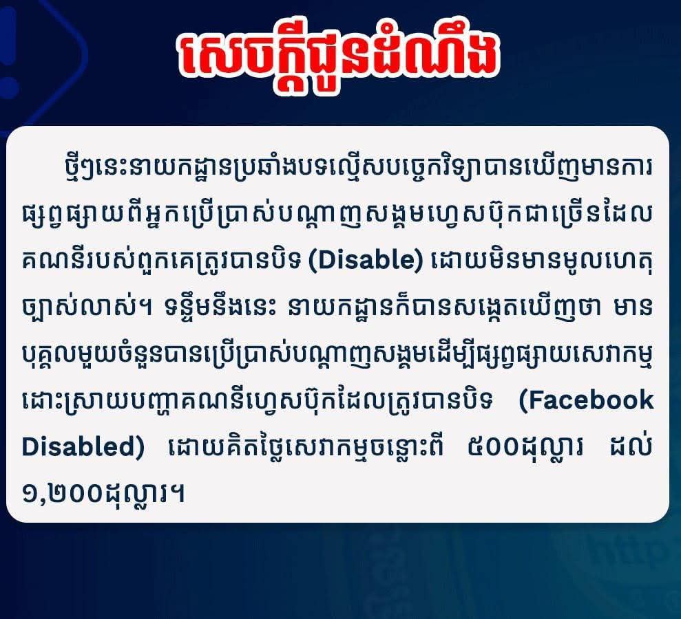 នៅក្នុងសេចក្តីជូនដំណឹងរបស់នាយកដ្ឋានប្រឆាំងបទល្មើសបច្ចេកវិទ្យា ដែលបណ្តាញព័ត៌មាន ទទួលបាននៅរសៀលថ្ងៃទី១៨ ខែតុលា ឆ្នាំ២០២៥ បានបញ្ជាក់ដូចនេះថា ថ្មីៗនេះនាយកដ្ឋានប្រឆាំងបទល្មើសបច្ចេកវិទ្យា បានឃើញមានការផ្សព្វផ្សាយពីអ្នកប្រើប្រាស់បណ្ដាញសង្គមហ្វេសប៊ុកជាច្រើន ដែលគណនីរបស់ពួកគេត្រូវបានបិទ (Disable) ដោយមិនមានមូលហេតុច្បាស់លាស់។ ទន្ទឹមនឹងនេះនាយកដ្ឋានក៏បានសង្កេតឃើញថា មានបុគ្គលមួយចំនួនបានប្រើប្រាស់បណ្ដាញសង្គមដើម្បីផ្សព្វផ្សាយសេវាកម្មដោះស្រាយបញ្ហាគណនីហ្វេសប៊ុកដែលត្រូវបានបិទ (Facebook Disabled) ដោយគិតថ្លៃសេវាកម្មចន្លោះពី ៥០០ដុល្លារ ដល់ ១,២០០ដុល្លារ។