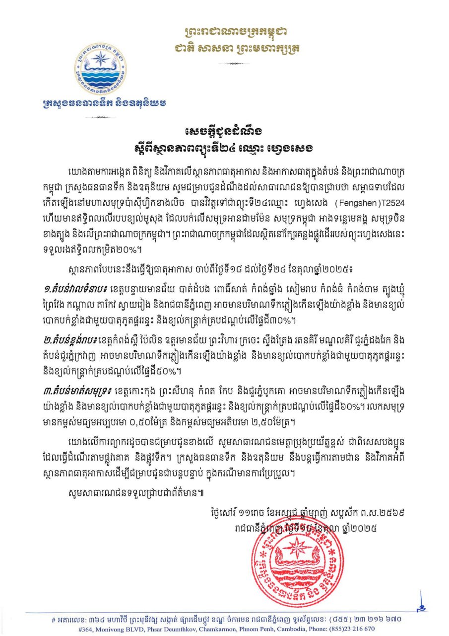 ក្រសួងធនធានទឹក និងឧតុនិយម សូមជម្រាបជូនដំណឹងដល់សាធារណជនឱ្យបានជ្រាបថា សម្ពាធទាបដែលកើតឡើងនៅមហាសមុទ្រប៉ាស៊ីហ្វិកខាងលិច បានវិវត្តទៅជាព្យុះទី២៤ឈ្មោះ ហ្វេងសេង (Fengshen)T2524 ស្ថានភាពបែបនេះនឹងធ្វើឱ្យធាតុអាកាស ចាប់ពីថ្ងៃទី១៨ ដល់ថ្ងៃទី២៤ ខែតុលាឆ្នាំ២០២៥។
