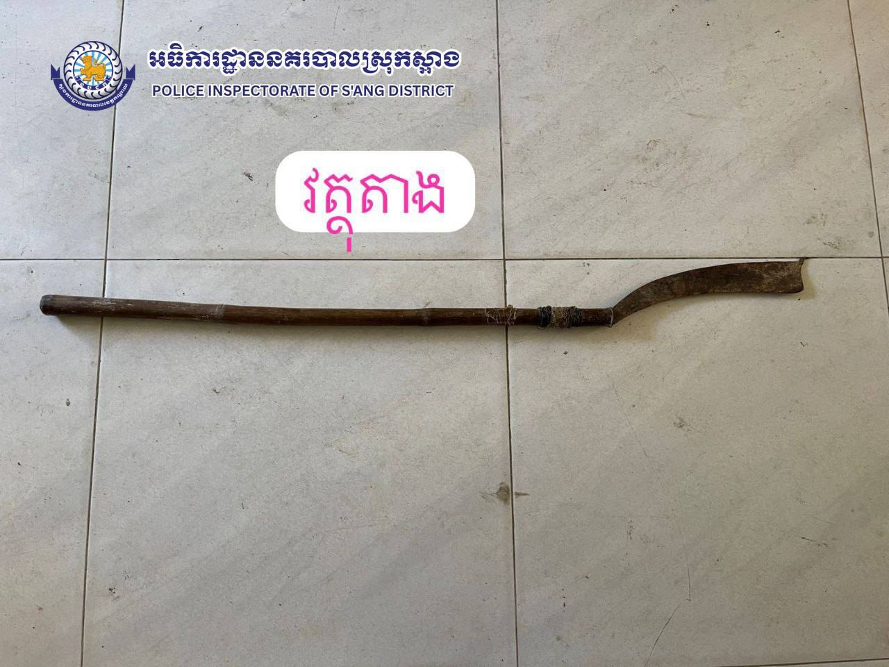 វត្ថុតាងចាប់យក: កាំបិតផ្គាក់ចំនួនចំនួន០១ដេីម មានប្រវែង១.១៧ម៉ែត្រ។