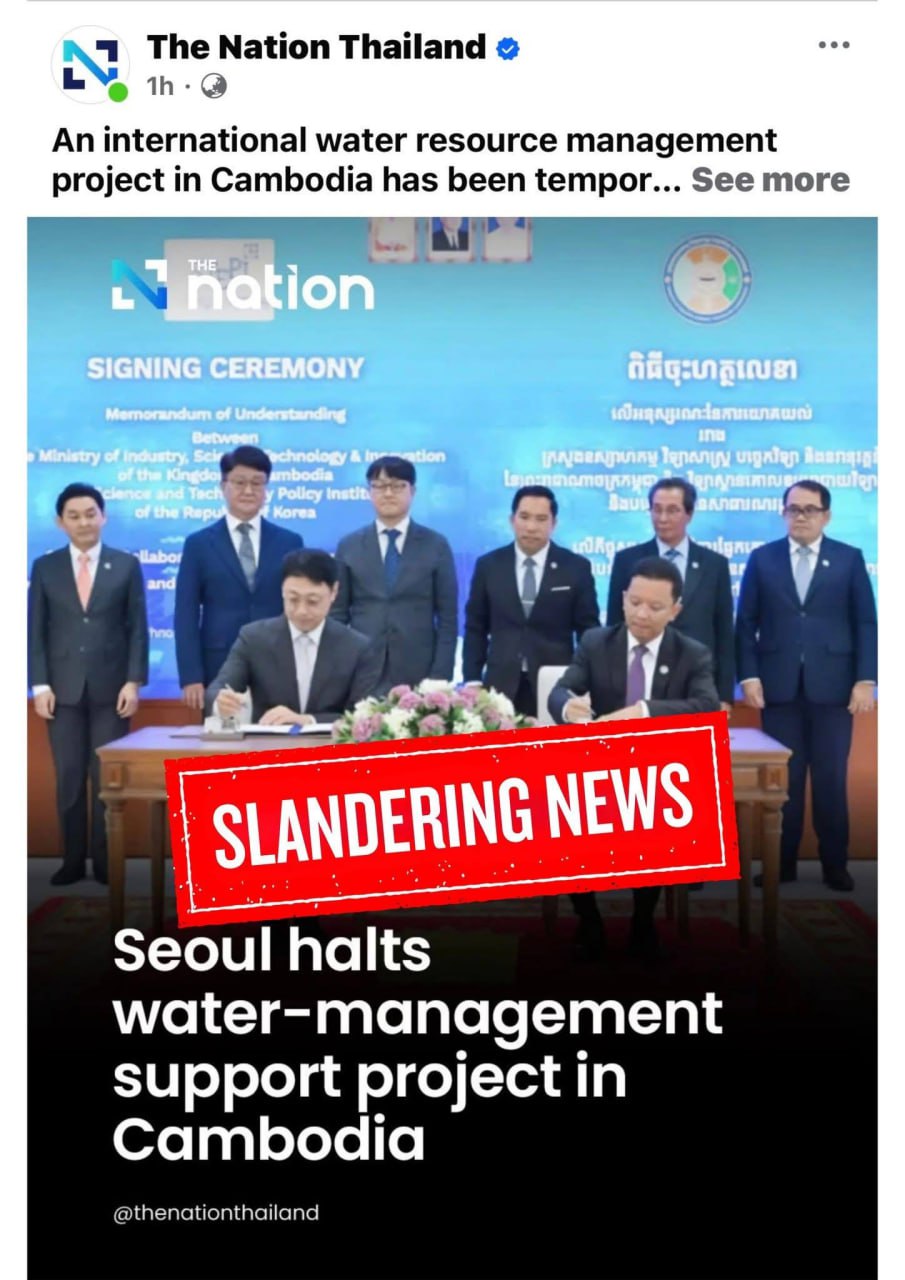 The Public Relations Unit of the Ministry of Industry, Science, Technology & Innovation (MISTI) strongly rejects the recent article published by The Nation Thailand on October 19, 2025, titled “Seoul halts water-management support project in Cambodia” with photos of MoU signing between MISTI and South Korea’s Science and Technology Policy Institute (STEPI).