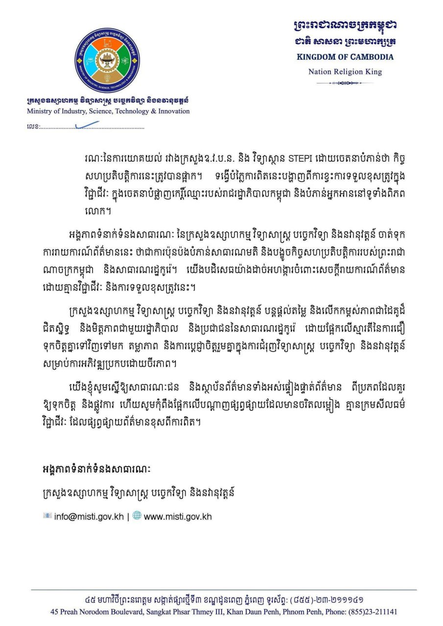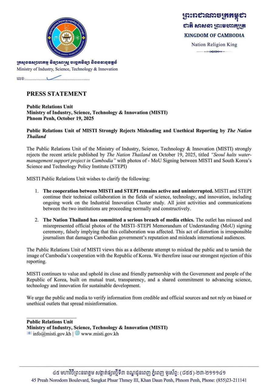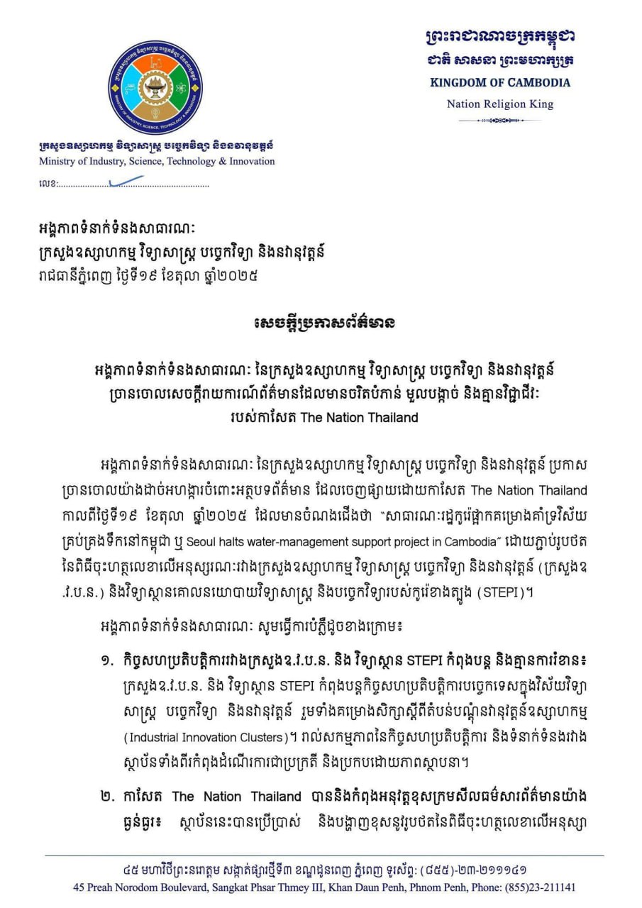 អង្គភាពទំនាក់ទំនងសាធារណៈ នៃក្រសួងឧស្សាហកម្ម វិទ្យាសាស្ត្រ បច្ចេកវិទ្យា និងនវានុវត្តន៍ ប្រកាសច្រានចោលយ៉ាងដាច់អហង្ការចំពោះអត្ថបទព័ត៌មាន ដែលចេញផ្សាយដោយកាសែត The Nation Thailand កាលពីថ្ងៃទី១៩ ខែតុលា ឆ្នាំ២០២៥ ដែលមានចំណងជើងថា “សាធារណរដ្ឋកូរ៉េផ្អាកគម្រោងគាំទ្រវិស័យគ្រប់គ្រងទឹកនៅកម្ពុជា ឬ Seoul halts water-management support project in Cambodia” ដោយភ្ជាប់រូបថតនៃពិធីចុះហត្ថលេខាលើអនុស្សរណៈរវាងក្រសួងឧស្សាហកម្ម វិទ្យាសាស្ត្រ បច្ចេកវិទ្យា និងនវានុវត្តន៍ (ក្រសួងឧ.វ.ប.ន.) និងវិទ្យាស្ថានគោលនយោបាយវិទ្យាសាស្ត្រ និងបច្ចេកវិទ្យារបស់កូរ៉េខាងត្បូង (STEPI)។