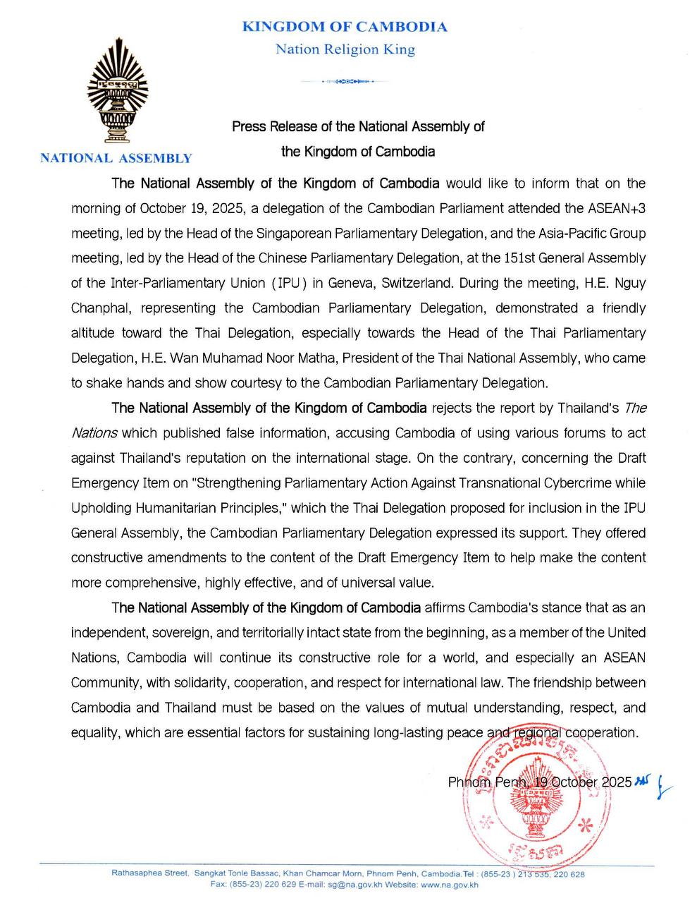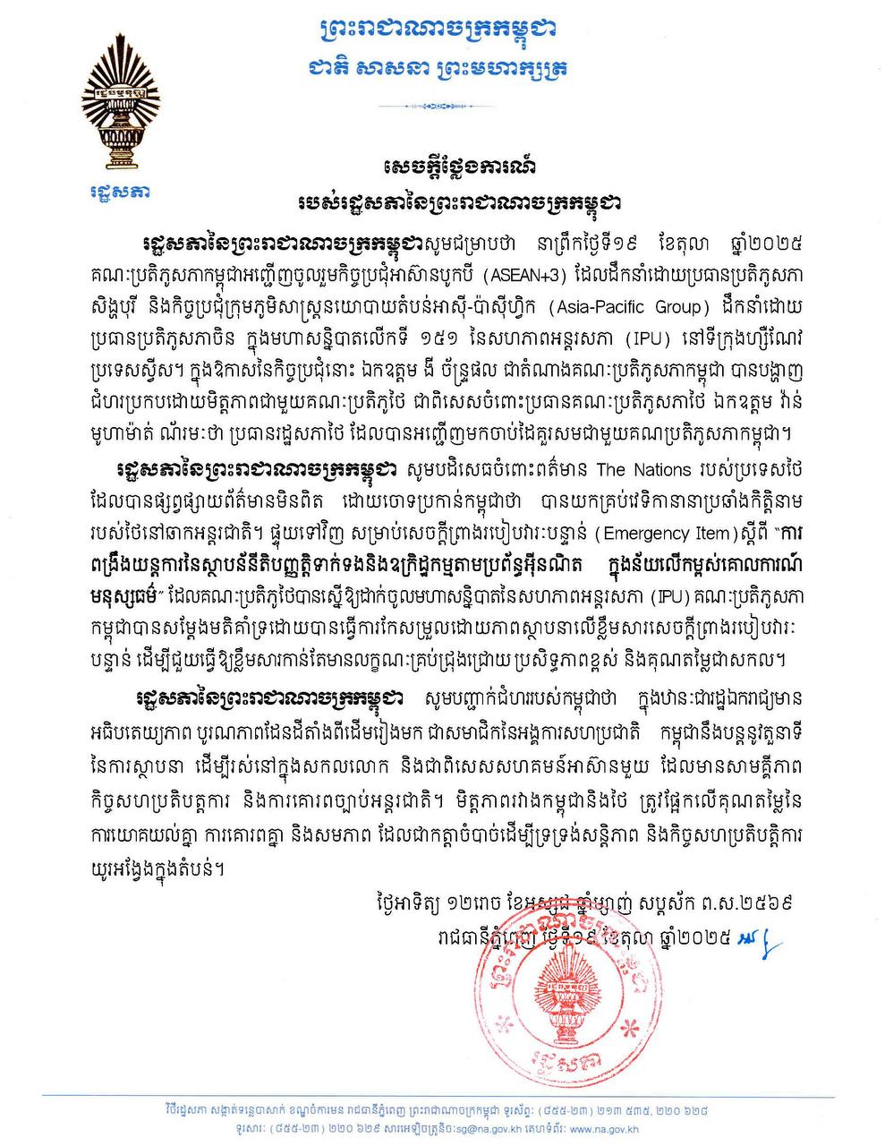 រដ្ឋសភាកម្ពុជា បដិសេធចំពោះព័ត៌មាន The Nations របស់ថៃ ដែលបាន​ផ្សព្វ​ផ្សាយ​ព័ត៌មានមិនពិត ដោយចោទប្រកាន់កម្ពុជាថា បានយកគ្រប់វេទិកា​នានា​ប្រឆាំងកិត្តិនាម របស់ថៃនៅឆាកអន្តរជាតិ