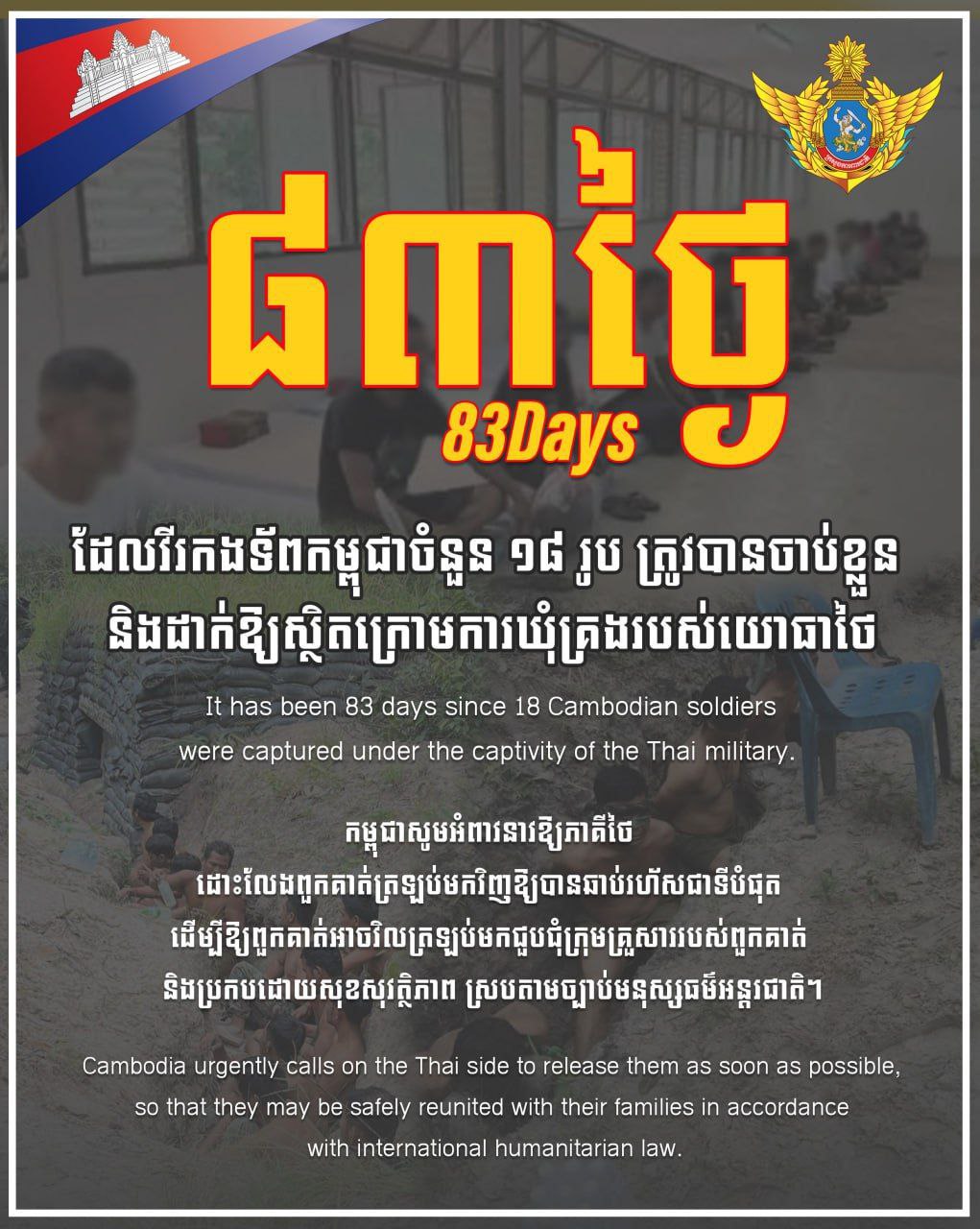 ថ្ងៃនេះជា ថ្ងៃទី៨៣ហើយ ដែលវីរកងទ័ពកម្ពុជាចំនួន ១៨រូប ត្រូវបានចាប់ខ្លួន និងដាក់ឱ្យស្ថិតក្រោមការឃុំគ្រងរបស់យោធាថៃ