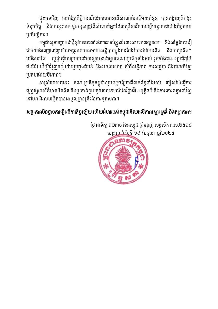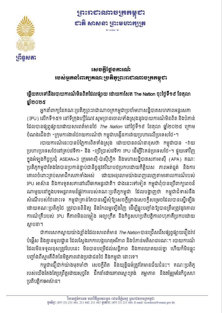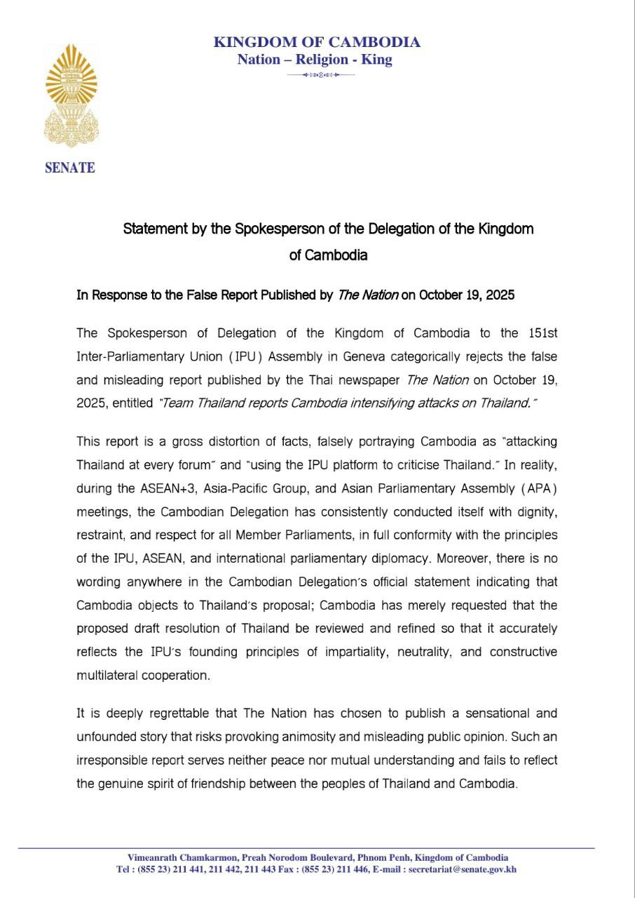 (ភ្នំពេញ)៖ អ្នកនាំពាក្យនៃគណៈប្រតិភូព្រះរាជាណាចក្រកម្ពុជាប្រចាំមហាសន្និបាតសហភាពអន្តរសភា (IPU) លើកទី១៥១ នៅទីក្រុងហ្សឺណែវ នៅថ្ងៃទី២០ ខែតុលា ឆ្នាំ២០២៥នេះ បានចេញសេចក្តីថ្លែងការណ៍ ច្រានចោលទាំងស្រុងនូវរបាយការណ៍មិនពិត និងបំភាន់ ដែលបានផ្សព្វផ្សាយដោយសារពត៌មានថៃ The Nation នៅថ្ងៃទី១៩ ខែតុលា ឆ្នាំ២០២៥ ក្រោមចំណងជើងថា «ក្រុមការងារថៃរាយការណ៍ថា កម្ពុជាបង្កើនការវាយប្រហារលើប្រទេសថៃ»។