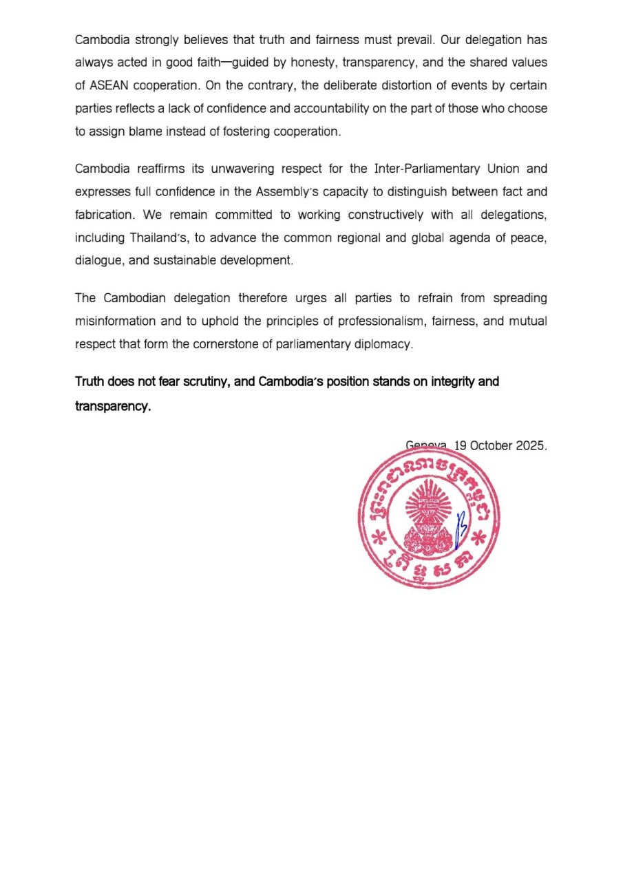 កម្ពុជាសូមបញ្ជាក់ជាថ្មីនូវការគោរពឥតងាករេរបស់ខ្លួនចំពោះសហភាពអន្តរសភា និងសម្តែងការជឿ ជាក់យ៉ាងពេញលេញលើសមត្ថភាពរបស់មហាសន្និបាតក្នុងការបែងចែករវាងការពិត និងការប្រឌិត។ យើងនៅតែ ប្តេជ្ញាធ្វើការប្រកបដោយស្ថាបនាជាមួយគណៈប្រតិភូទាំងអស់ រួមទាំងគណៈប្រតិភូថៃ ផងដែរ ដើម្បីជំរុញរបៀបវារៈរួមក្នុងតំបន់ និងសកលលោក ស្តីពីសន្តិភាព ការសន្ទនា និងការអភិវឌ្ឍ ប្រកបដោយចីរភាព។