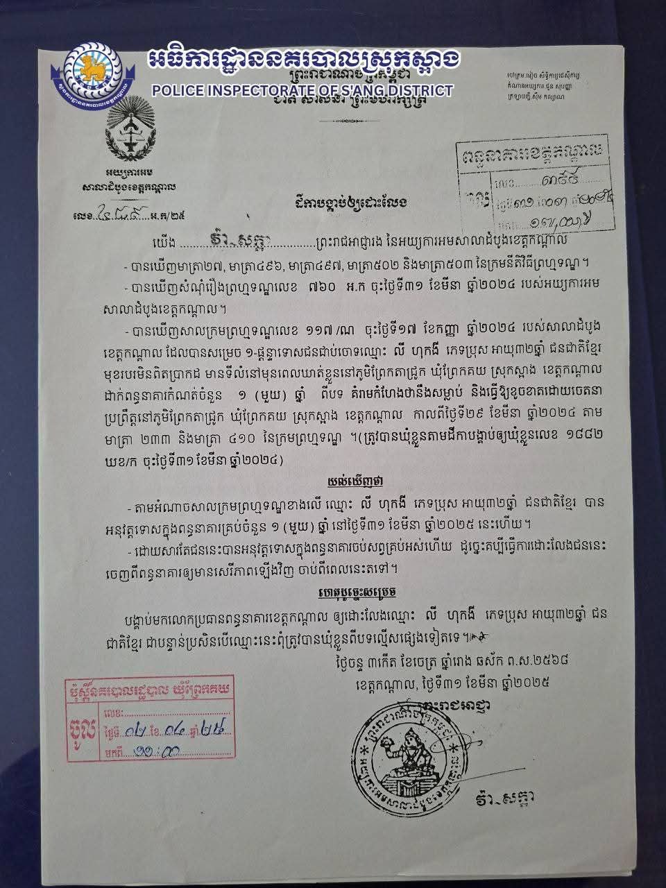 ខេត្តកណ្តាល÷ អនុវត្តតាមបទបញ្ជាលោកវរសេនីយ៍ឯក រស់ ចន្ថា អធិការនគរបាលស្រុកស្អាង កម្លាំងនគរបាលផ្នែកព្រហ្មទណ្ឌស្រុកស្អាង សហការជាមួយកម្លាំងប៉ុស្តិ៍នគរបាលរដ្ឋបាលព្រែកគយឃាត់ខ្លួនជនសង្ស័យ១នាក់ ករណីគំរាមកំហែងថា នឹងសម្លាប់។