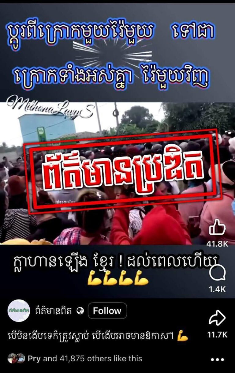 បើតាមលោក ស៊ុន មេសា ម្ចាស់ហ្វេសប៊ុកផេក ព័ត៌មានពិត កំពុងយករូបភាពសកម្មភាពកម្មករទៅកាត់តច្នៃប្រឌិតក្នុងចេតនាញុះញង់ប្រជាពលរដ្ឋតាមរយៈបណ្តាញសង្គមឱ្យងើបឡើងបះបោរ ផ្តួលរំលំរាជរដ្ឋាភិបាលស្របច្បាប់ និងកៀរគរប្រជាពលរដ្ឋឱ្យធ្វើសកម្មភាពផ្សេងៗផ្ទុយនឹងច្បាប់។ លោកបន្តថា នេះជារឿងអគុណធម៌បំផុត ដែលម្ចាស់ហ្វេសប៊ុកផេកមួយនេះខំប្រឹងមួលបង្កាច់ លាបពណ៌ ទម្លាក់កំហុសគ្រប់បែបយ៉ាងមកលើរាជរដ្ឋាភិបាល៕
