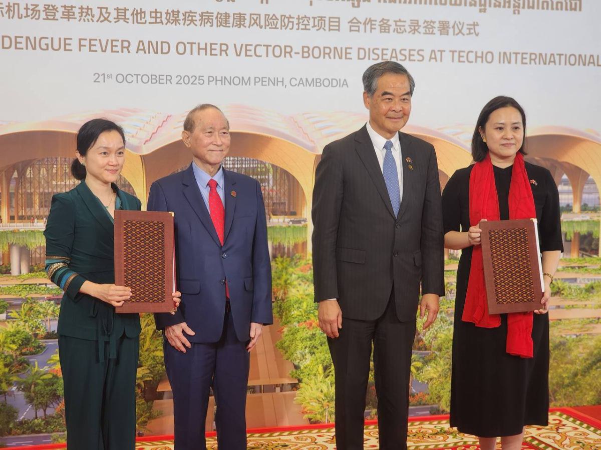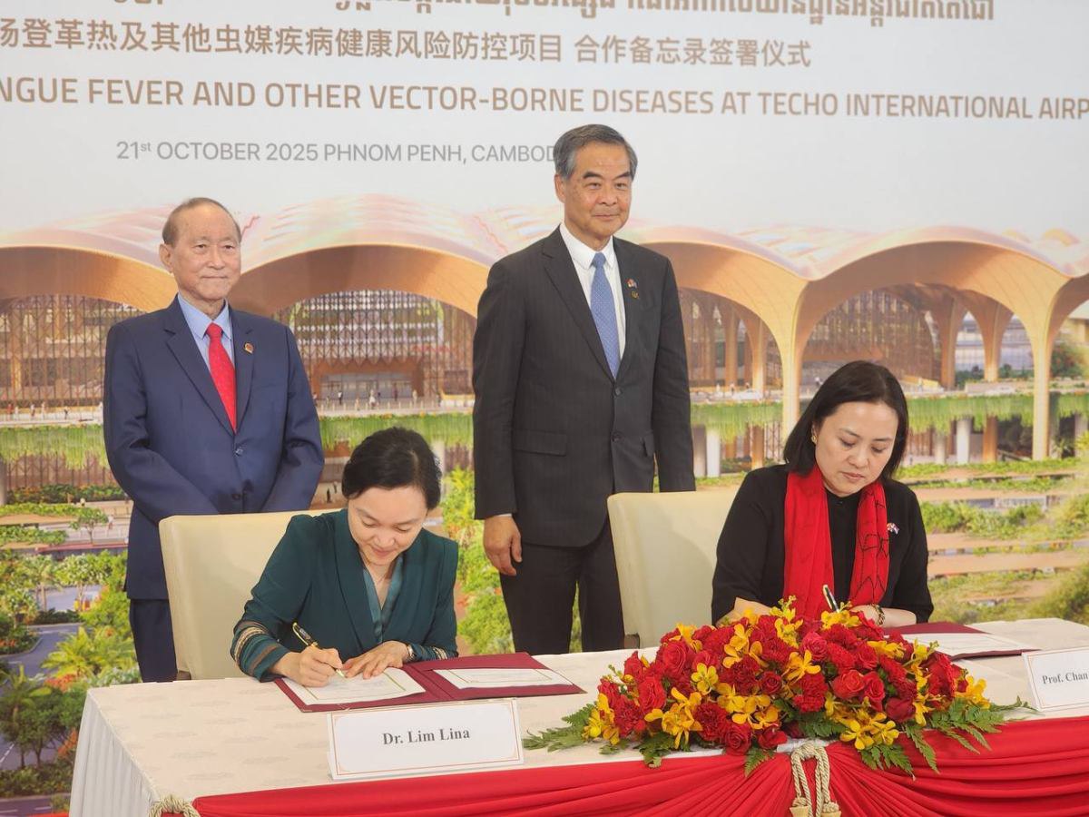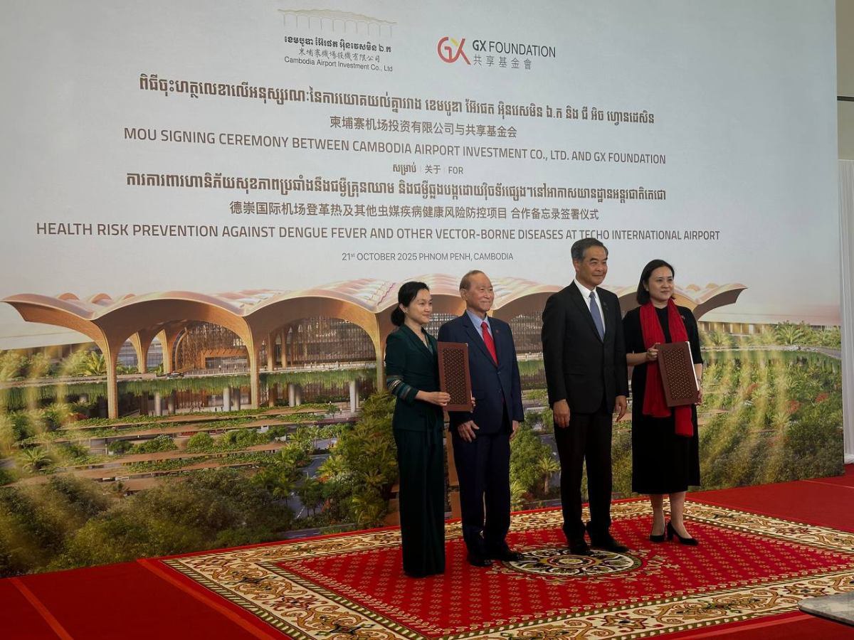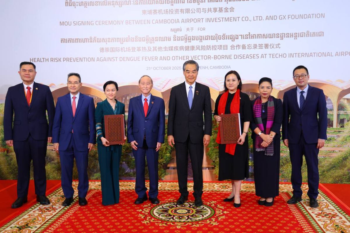 ភ្នំពេញ៖ ក្រុមហ៊ុន ខេមបូឌា អ៊ែរផត អ៊ិនវេសមិន ឯ.ក និង ជីអិច ហ្វោនដេសិន ហៅកាត់ CAIC និងមូលនិធិ ជីអិច ហ្វោនដេសិន (GX FOUNDATION) របស់សាធារណរដ្ឋប្រជាមានិតចិន បានចុះហត្ថលេខាលើអនុស្សរណៈនៃការយោគយល់គ្នា ស្តីពីការការពារហានិភ័យសុខភាពប្រឆាំងនឹងជម្ងឺគ្រុនឈាម និងជម្ងឺឆ្លងបង្កដោយវ៉ិចទ័រផ្សេងៗនៅអាកាសយានដ្ឋានអន្តរជាតិតេជោ។