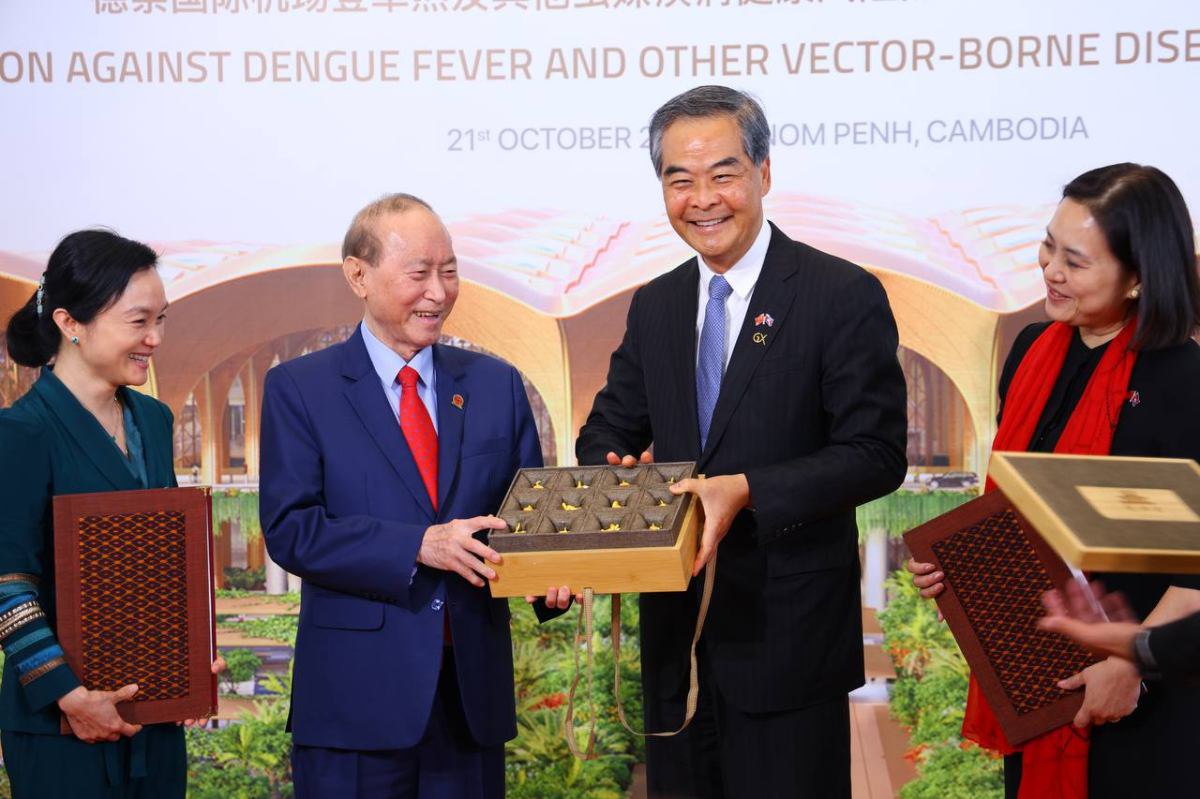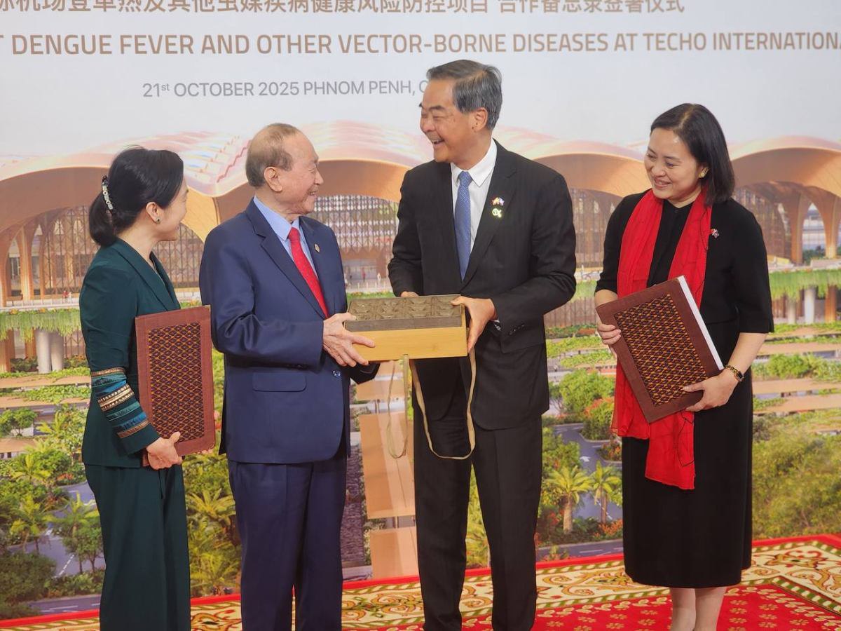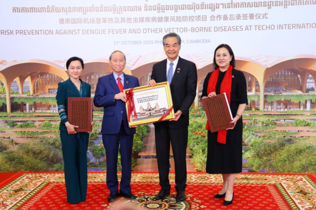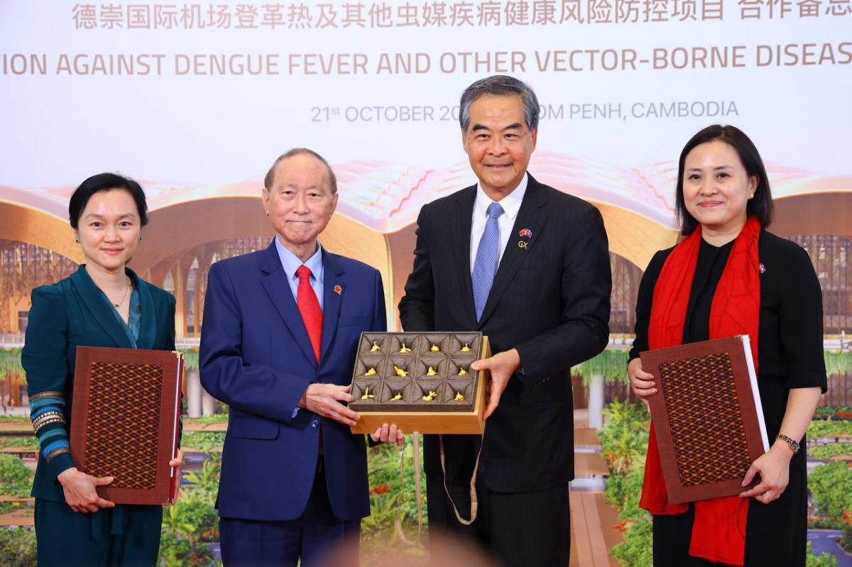 ភ្នំពេញ៖ ក្រុមហ៊ុន ខេមបូឌា អ៊ែរផត អ៊ិនវេសមិន ឯ.ក និង ជីអិច ហ្វោនដេសិន ហៅកាត់ CAIC និងមូលនិធិ ជីអិច ហ្វោនដេសិន (GX FOUNDATION) របស់សាធារណរដ្ឋប្រជាមានិតចិន បានចុះហត្ថលេខាលើអនុស្សរណៈនៃការយោគយល់គ្នា ស្តីពីការការពារហានិភ័យសុខភាពប្រឆាំងនឹងជម្ងឺគ្រុនឈាម និងជម្ងឺឆ្លងបង្កដោយវ៉ិចទ័រផ្សេងៗនៅអាកាសយានដ្ឋានអន្តរជាតិតេជោ។