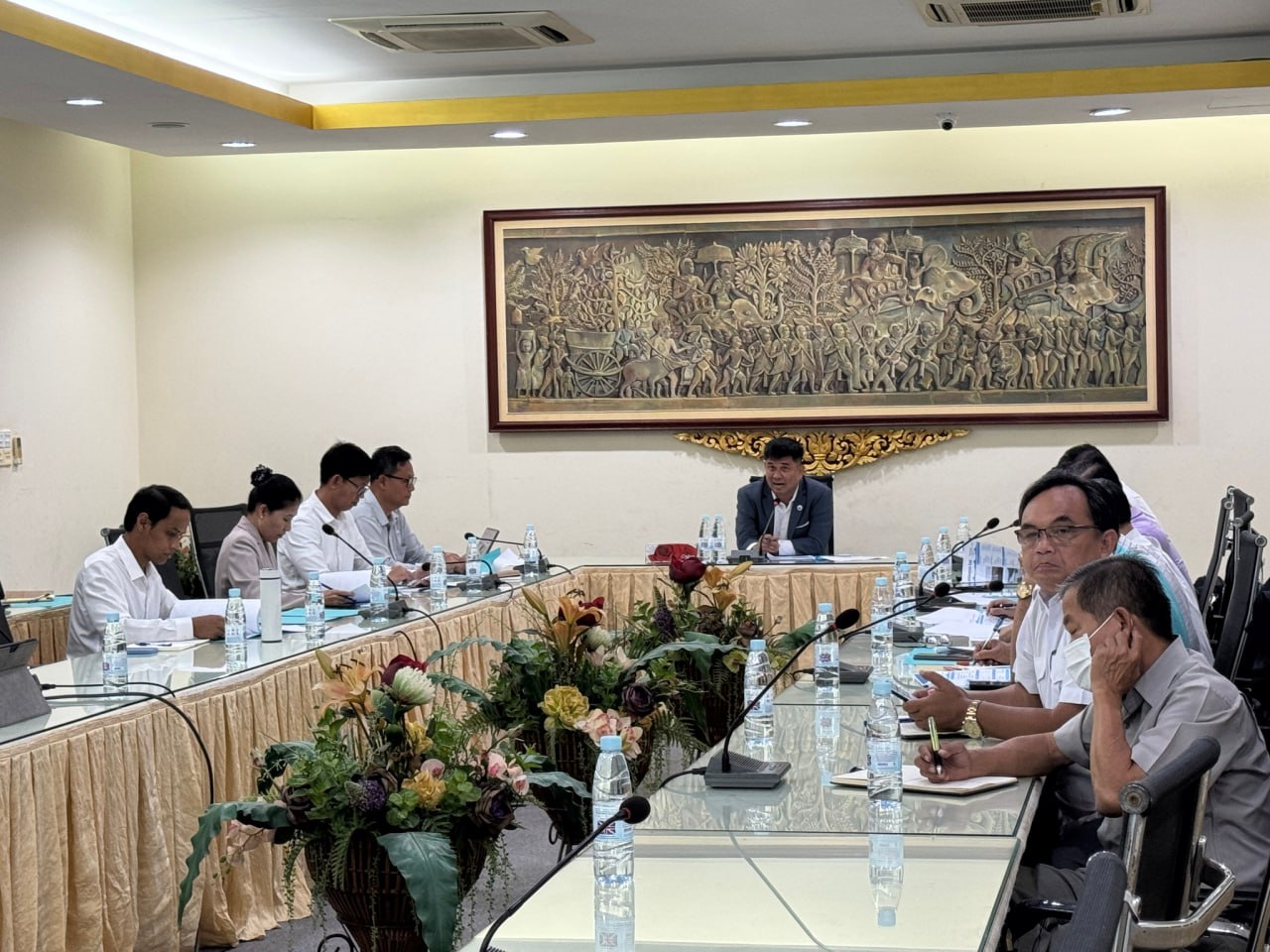 នៅសាលប្រជុំនៃទីស្តីក្រសួង នារសៀលថ្ងៃចន្ទ ១៣រោច ខែអស្សុជ ឆ្នាំម្សាញ់ សប្តស័ក ពុទ្ធសករាជ ២៥៦៩ ត្រូវនឹងថ្ងៃទី២០ ខែតុលា ឆ្នាំ២០២៥នេះ ឯកឧត្តមសាស្រ្តាចារ្យបណ្ឌិត អឿង ចន្ថា អនុរដ្ឋលេខាធិការ តំណាងដ៏ខ្ពង់ខ្ពស់ឯកឧត្តម ថោ ជេដ្ឋា រដ្ឋមន្ត្រីក្រសួងធនធានទឹក និងឧតុនិយម បានអញ្ជើញដឹកនាំសម្របសម្រួលកិច្ចប្រជុំបន្តពិនិត្យ ពិភាក្សាពិគ្រោះយោបល់លើខ្លឹមសារ និងបញ្ចប់ការប្រមូលធាតុចូលក្នុងការរៀបចំសៀវភៅទិដ្ឋភាពទូទៅ និងកំណត់ចំណាំអាងទឹកធំៗនៅប្រទេសកម្ពុជា។