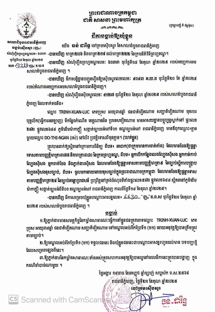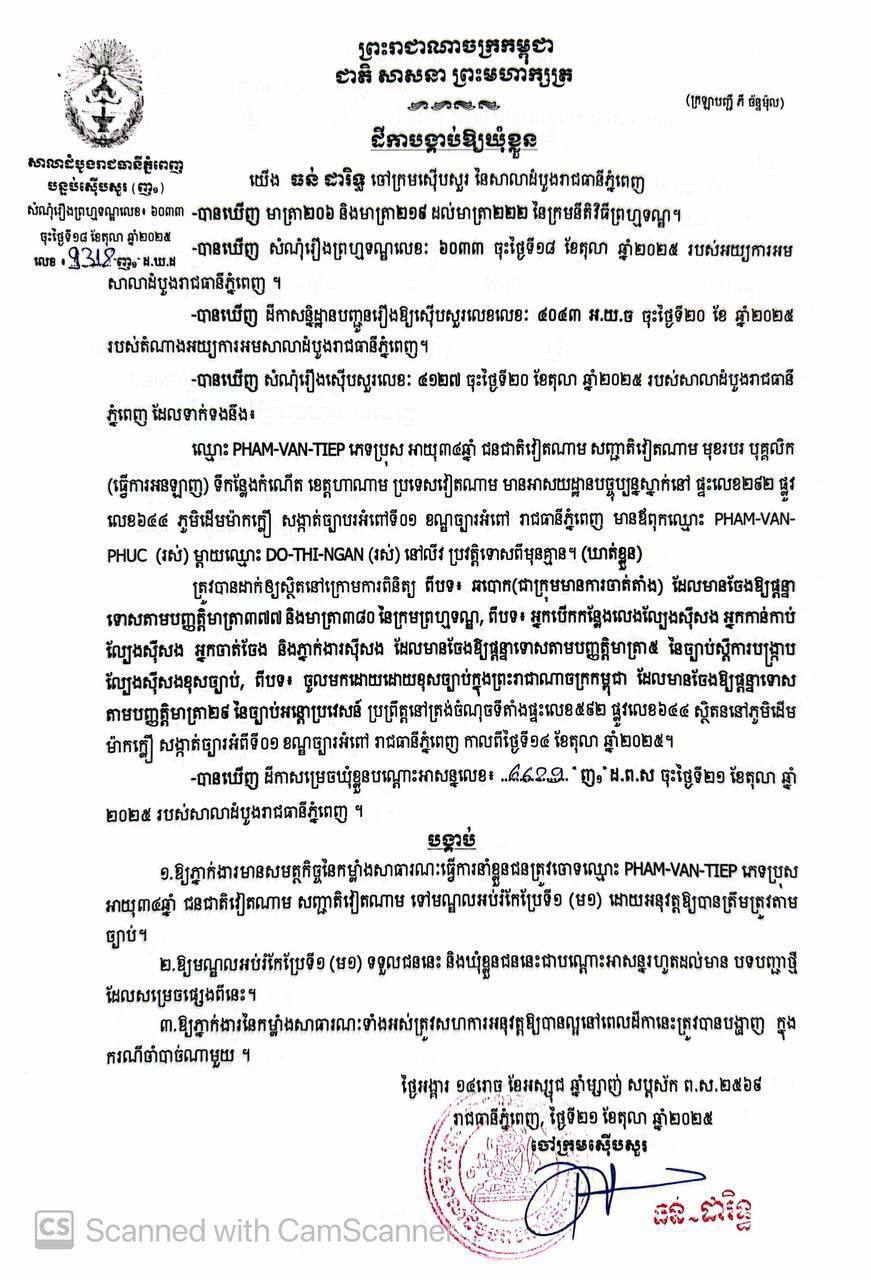 (ភ្នំពេញ)៖ ដោយផ្អែកលើលទ្ធផលស៊ើបអង្កេតរបស់សមត្ថកិច្ច លោក ធន់ ដារិទ្ធ ចៅក្រមស៊ើបសួរ សាលាដំបូងរាជធានីភ្នំពេញ នៅថ្ងៃទី២១ ខែតុលា ឆ្នាំ២០២៥ បានចេញដីកាចំនួន២ បង្គាប់ឱ្យឃុំខ្លួនបណ្តោះអាសន្ន លើជនជាតិវៀតណាមចំនួន២នាក់ គឺទី១ ឈ្មោះ PHAM VAN TIEP ភេទប្រុស អាយុ៣៤ ឆ្នាំ និងទី២ឈ្មោះ TRINH XUAN LUC ភេទប្រុស អាយុ ៣៤ឆ្នាំ នៅមណ្ឌលអប់រំកែប្រែទី១ “ម១” ដើម្បីបន្តនីតិវិធីរបស់តុលាការ។