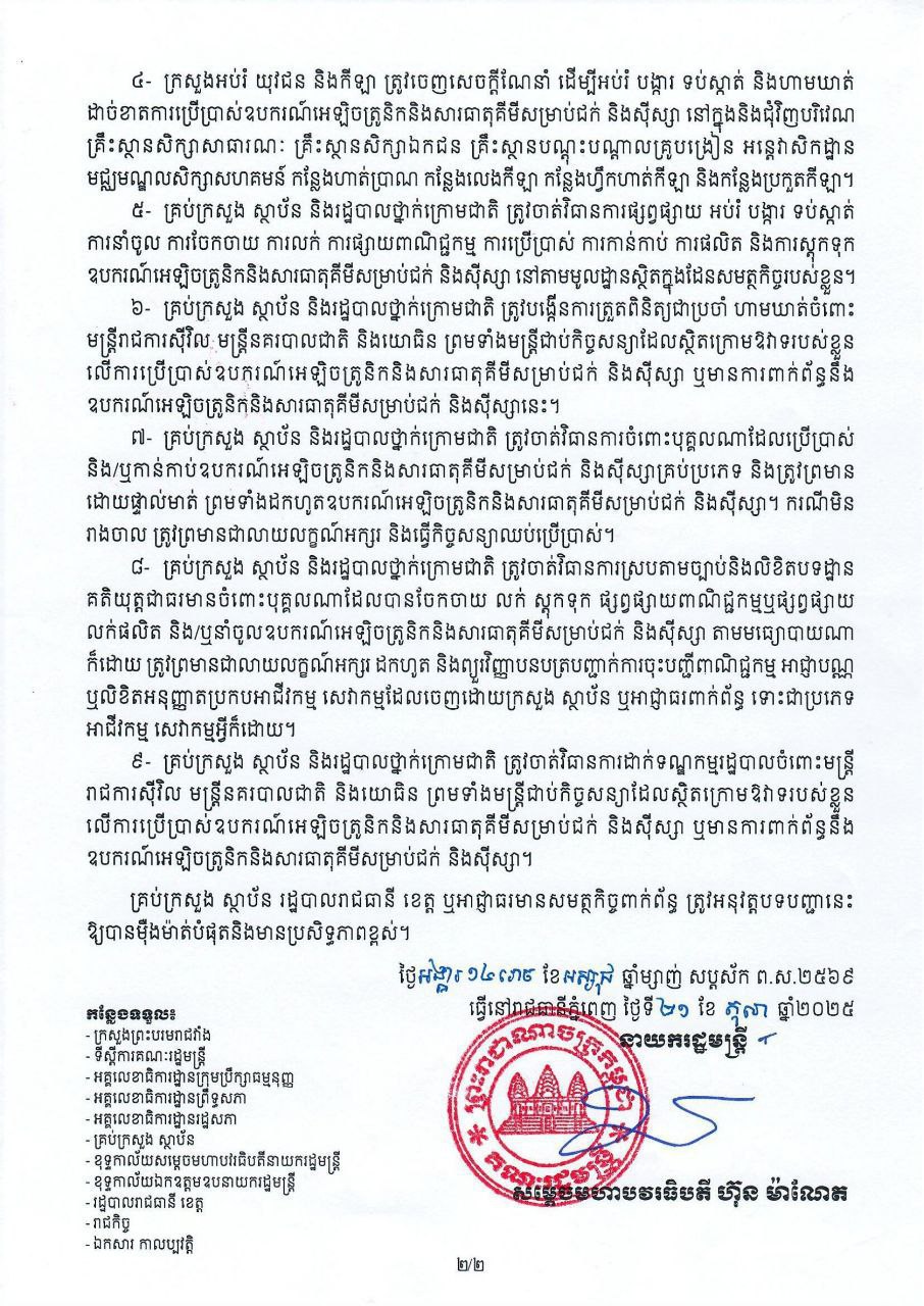 ២៖ ក្រសួងមហាផ្ទៃ ក្រសួងសេដ្ឋកិច្ចនិងហិរញ្ញវត្ថុ ក្រសួងពាណិជ្ជកម្ម ក្រសួងព័ត៌មាន និងក្រសួងប្រៃសណីយ៍ និងទូរគមនាគមន៍ ត្រូវមានវិធានការទប់ស្កាត់ការនាំចូល ការចែកចាយ ការផ្សាយពាណិជ្ជកម្ម ការលក់ និង ការស្តុកទុកឧបករណ៍អេឡិចត្រូនិកនិងសារធាតុគីមីសម្រាប់ជក់ និងស៊ីស្សា។