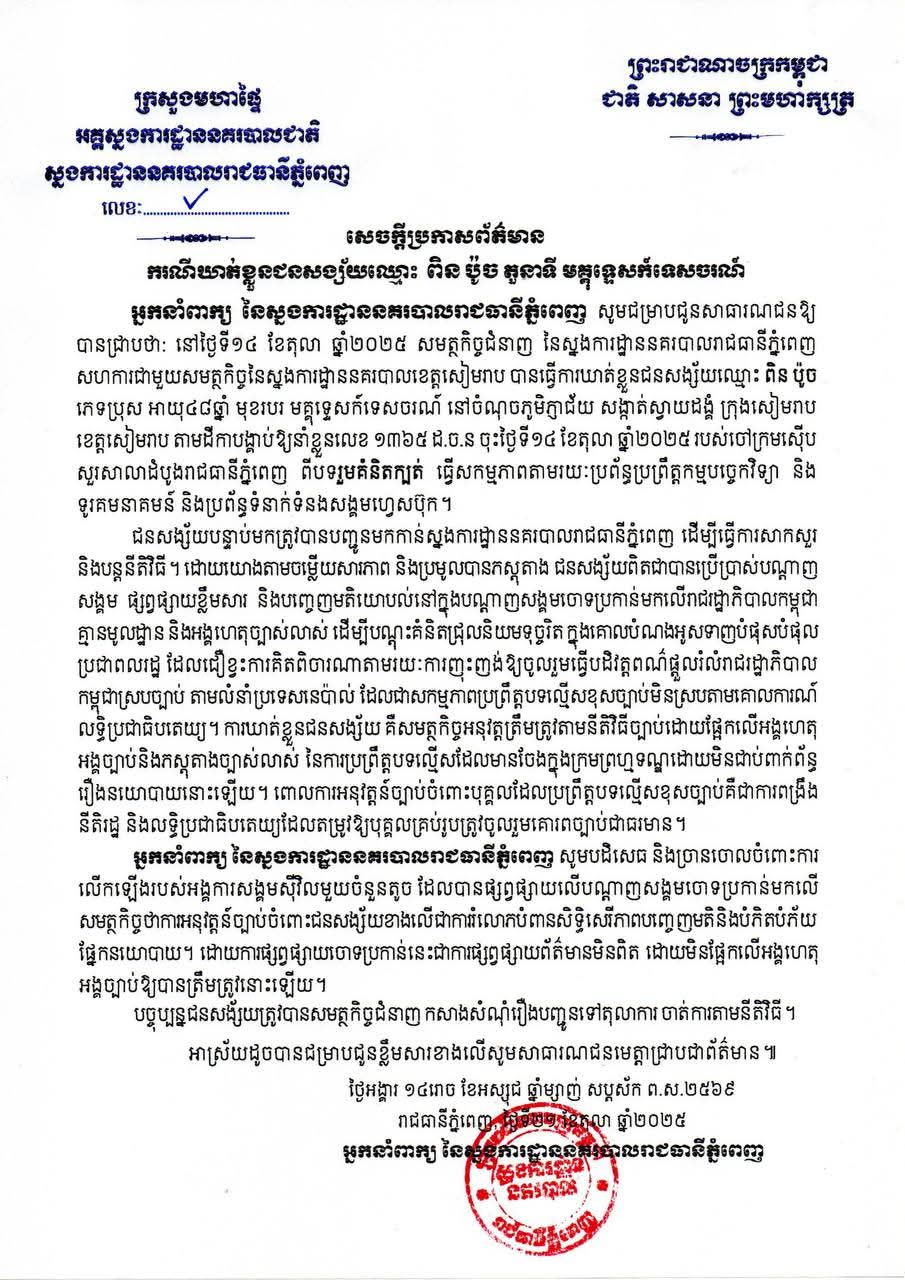 (ភ្នំពេញ)៖ សមត្ថកិច្ចជំនាញ នៃស្នងការដ្ឋាននគរបាលរាជធានីភ្នំពេញ សហការជាមួយសមត្ថកិច្ច នៃស្នងការដ្ឋាននគរបាលខេត្តសៀមរាប នៅថ្ងៃទី១៤ ខែតុលា ឆ្នាំ២០២៥ បានធ្វើការ ឃាត់ខ្លួនជនសង្ស័យឈ្មោះ ពិន ប៉ូច ភេទប្រុស អាយុ៤៨ឆ្នាំ មុខរបរ មគ្គុទ្ទេសក៍ទេសចរណ៍ នៅចំណុចភូមិភ្ញាជ័យ សង្កាត់ស្វាយដង្គំ ក្រុងសៀមរាប ខេត្តសៀមរាប។