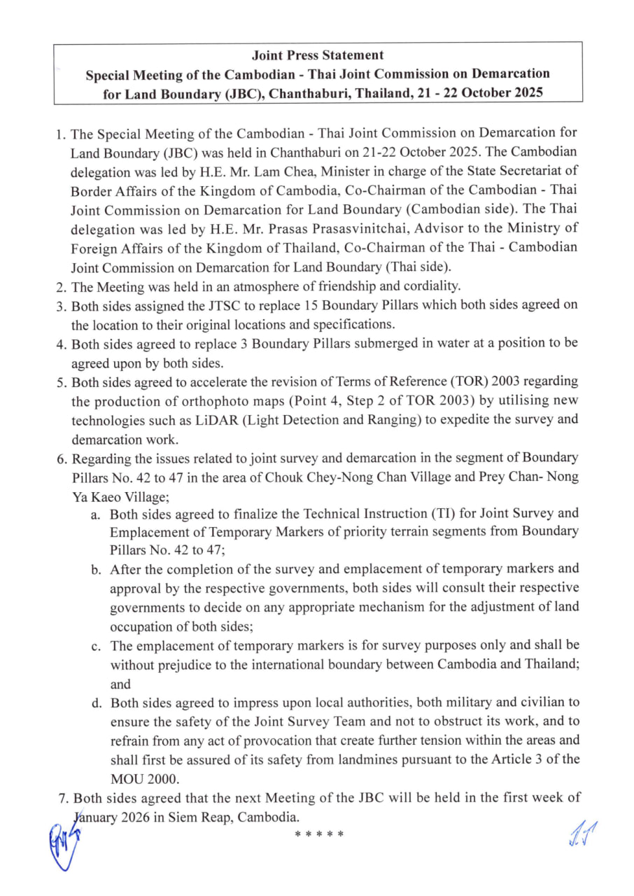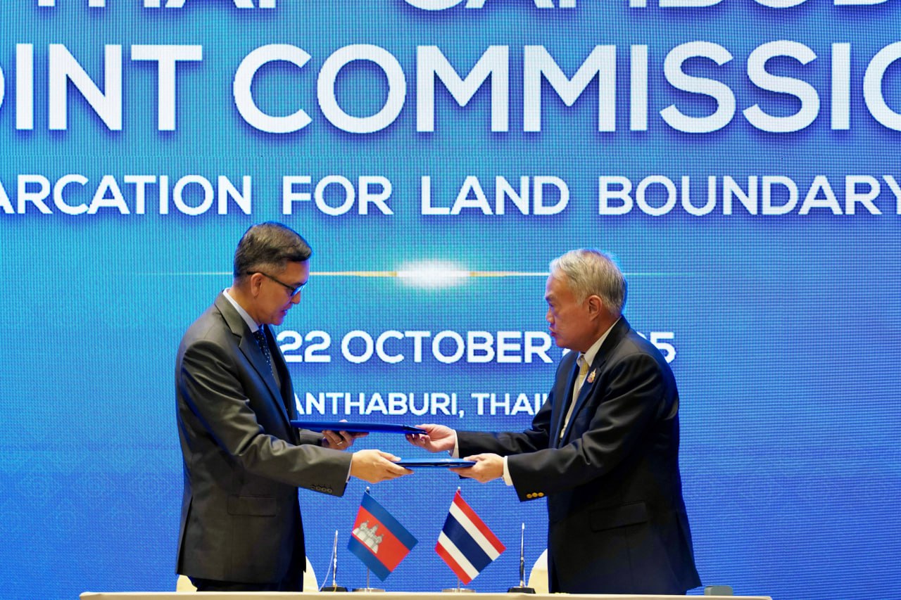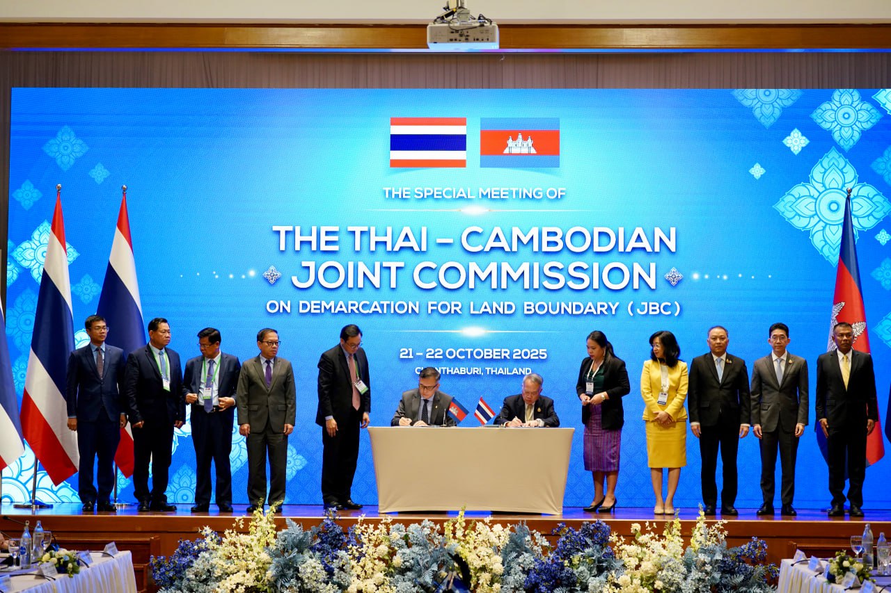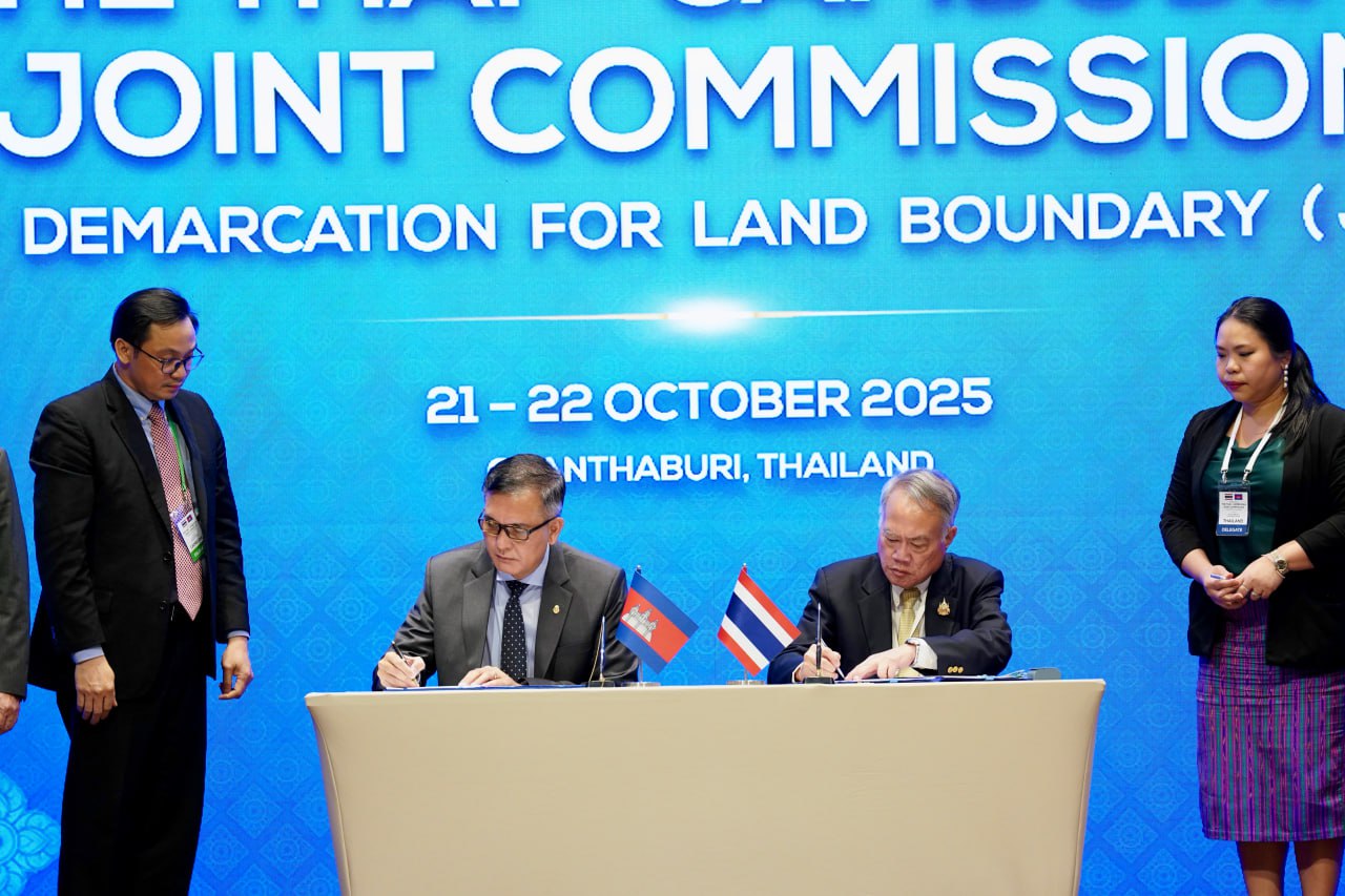 (ចន្ទបុរី, ថៃ)៖ បន្ទាប់ពីចំណាយពេលប្រជុំប្រកបដោយភាពតានតឹង កិច្ចប្រជុំពិសេសគណៈកម្មការចម្រុះខណ្ឌសីមាព្រំដែនគោក (JBC) កម្ពុជា-ថៃ បានឈានដល់ការចុះហត្ថលេខាលើសេចក្តីថ្លែងការណ៍រួមពាក់ព័ន្ធលើការងារព្រំដែននៃប្រទេសទាំងពីហើយ។