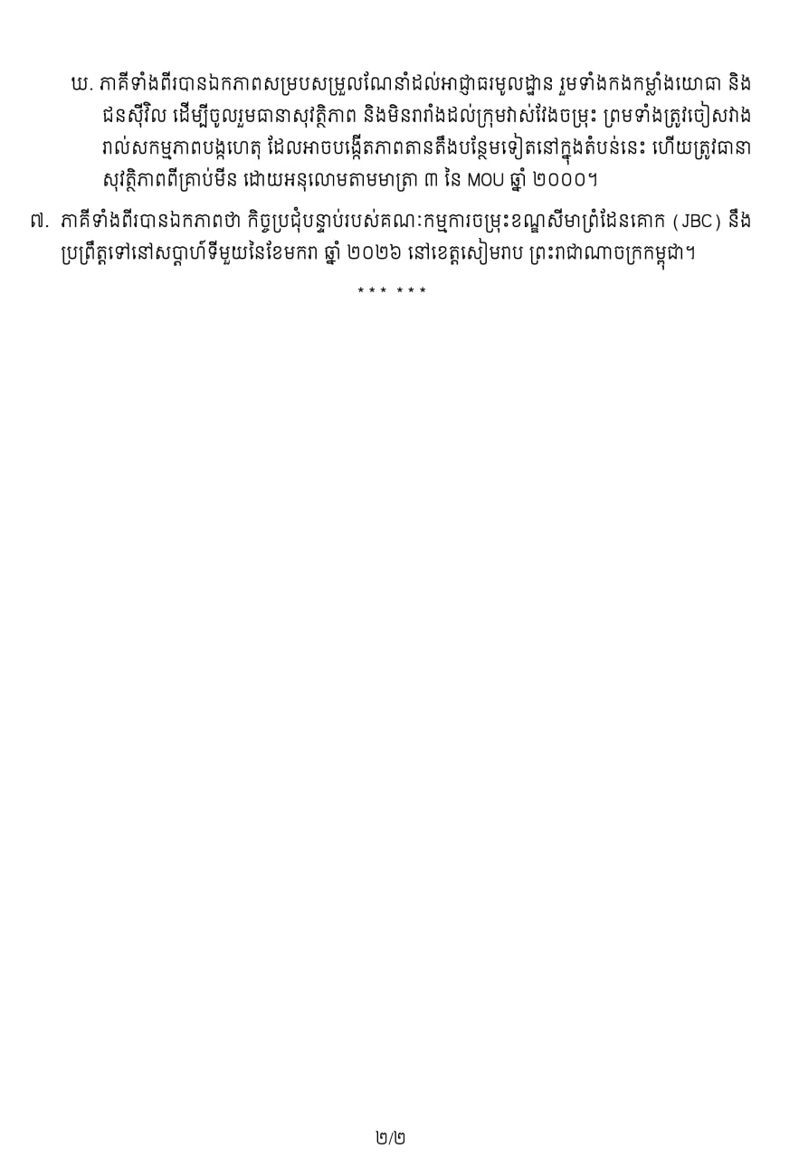 សេចក្តីថ្លែងការណ៍រួមនេះ ត្រូវបានចុះហត្ថលេខាដោយលោក លោក ឡាំ ជា រដ្ឋមន្ត្រីទទួលបន្ទុករដ្ឋលេខាធិការដ្ឋានកិច្ចការព្រំដែន និងជាប្រធានគណៈកម្មការចម្រុះព្រំដែនកម្ពុជា-ថៃ និងលោក Prasas Prasasvinitchai ទីប្រឹក្សាក្រសួងការបរទេស និងជាប្រធានគណៈកម្មការចម្រុះព្រំដែនថៃ-កម្ពុជា។