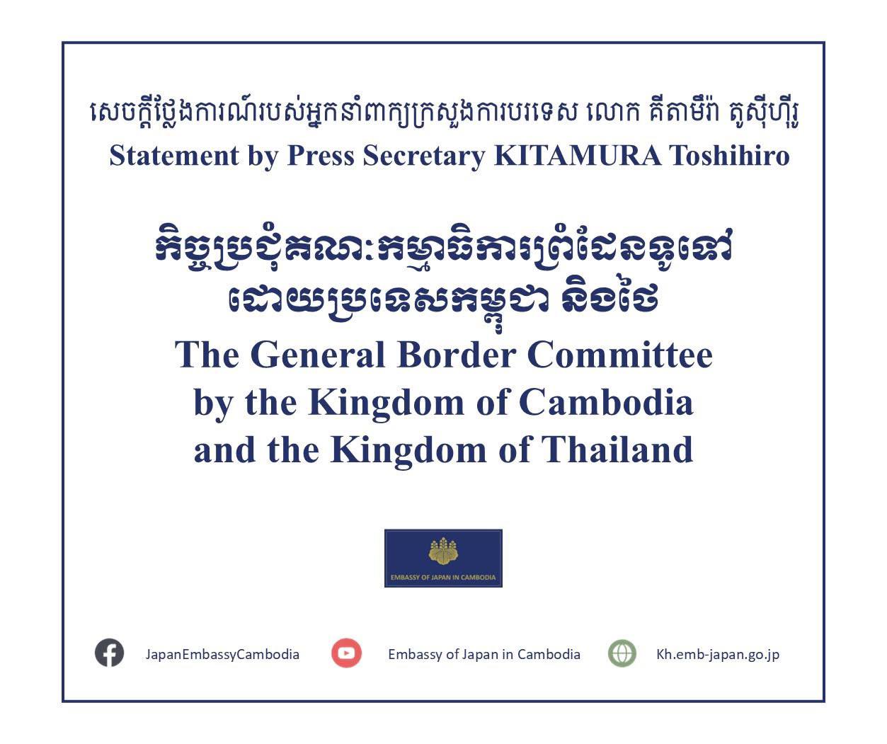 អ្នកនាំពាក្យក្រសួងការបរទេសជប៉ុន នៅថ្ងៃទី២៣ ខែតុលា ឆ្នាំ២០២៥ នេះ បានចេញ សេចក្តីថ្លែងការណ៍ ស្តីពី កិច្ចប្រជុំគណៈកម្មាធិការព្រំដែនទូទៅកម្ពុជា-ថៃ ដោយ រដ្ឋាភិបាលជប៉ុនសូមស្វាគមន៍ ចំពោះវឌ្ឍនភាពកិច្ចប្រជុំគណៈកម្មាធិការព្រំដែនទូទៅកម្ពុជា-ថៃ ដែលបានធ្វើឡើងនាថ្ងៃទី២៣ ខែតុលា នៅប្រទេសម៉ាឡេស៊ី ដែលបានពិភាក្សាអំពីការវិលត្រឡប់ទៅរកប្រក្រតីភាពឡើងវិញ នៃទំនាក់ទំនងរវាងប្រទេសទាំងពីរ និងឯកភាពគ្នាលើការបង្កើតក្រុមសង្កេតការណ៍អាស៊ាន(AOT) ដែលជាការរួមចំណែកក្នុងការធ្វើឱ្យកិច្ចព្រមព្រៀងបទឈប់បាញ់កាន់តែមានភាពច្បាស់លាស់។