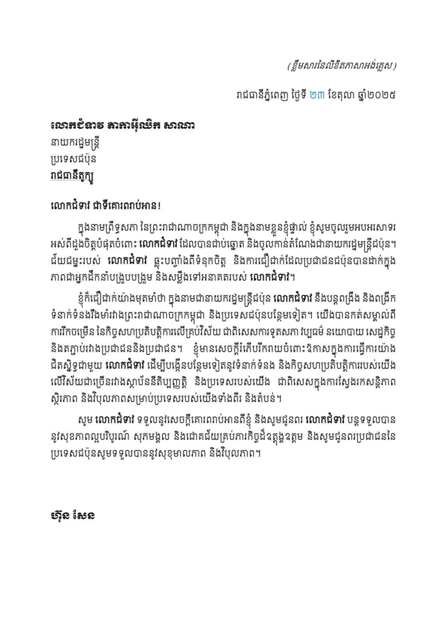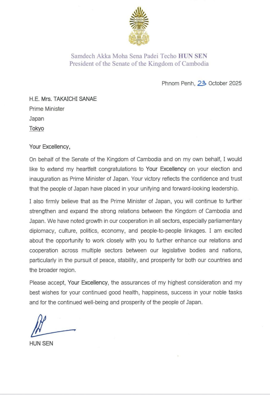 សម្តេចអគ្គមហាសេនាបតីតេជោ ហ៊ុន សែន ប្រធានព្រឹទ្ធសភានៃព្រះរាជាណាចក្រកម្ពុជា ផ្ញើសារលិខិតអបអរសាទរជូន លោកជំទាវ Takaichi Sanae ក្នុងឱកាសលោកជំទាវបានជាប់ឆ្នោត និងចូលកាន់តំណែងជានាយករដ្ឋមន្ត្រីជប៉ុន ៕