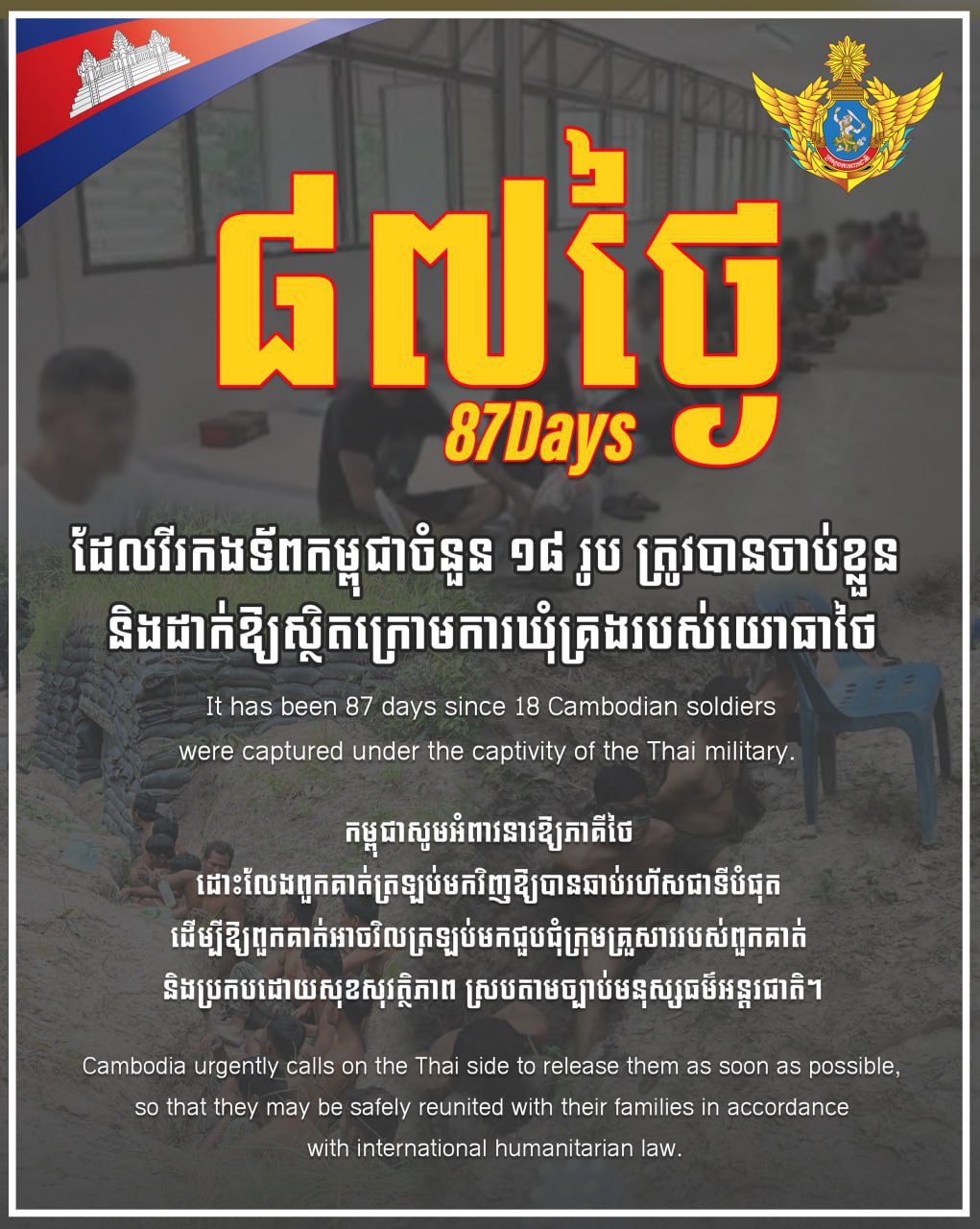 ថ្ងៃនេះជា ថ្ងៃទី៨៧ហើយ ដែលវីរកងទ័ពកម្ពុជាចំនួន ១៨រូប ត្រូវបានចាប់ខ្លួន និងដាក់ឱ្យស្ថិតក្រោមការឃុំគ្រងរបស់យោធាថៃ