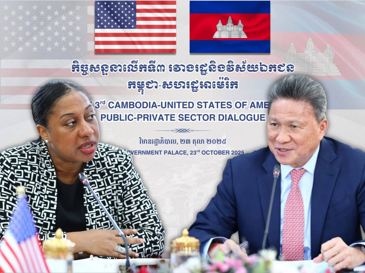 ( ភ្នំពេញ) នាថ្ងៃទី២៣ ខែតុលា ឆ្នាំ២០២៥ ឯកឧត្តម ស៊ុន ចាន់ថុល ឧបនាយករដ្ឋមន្រ្តី អនុប្រធានទី១ ក្រុមប្រឹក្សាអភិវឌ្ឍន៍កម្ពុជា រួមជាមួយលោកស្រី Bridgette L. Walker ភារធារីស្ថានទូតសហរដ្ឋអាម៉េរិកប្រចាំកម្ពុជា បានអញ្ជើញដឹកនាំកិច្ចសន្ទនាលើកទី៣ រវាងរដ្ឋនិងវិស័យឯកជន កម្ពុជា-សហរដ្ឋអាម៉េរិក ដោយមានការចូលរួមពី លោក Casey Barnett ប្រធានសភាពាណិជ្ជកម្មអាម៉េរិកនៅកម្ពុជា (AmCham Cambodia), ឯកឧត្តម លោកជំទាវ តំណាងក្រសួង/ស្ថាប័នពាក់ព័ន្ធ, តំណាងក្រុមប្រឹក្សាធុរកិច្ចសហរដ្ឋអាម៉េរិក-អាស៊ាន (US-ABC), វិស័យឯកជន និងមន្ត្រីជំនាញជាច្រើនរូប។