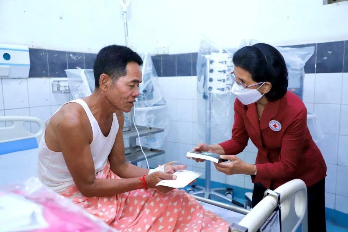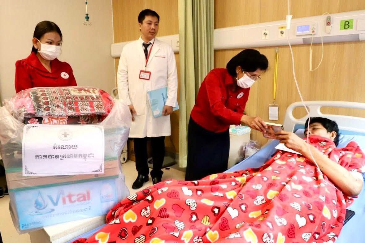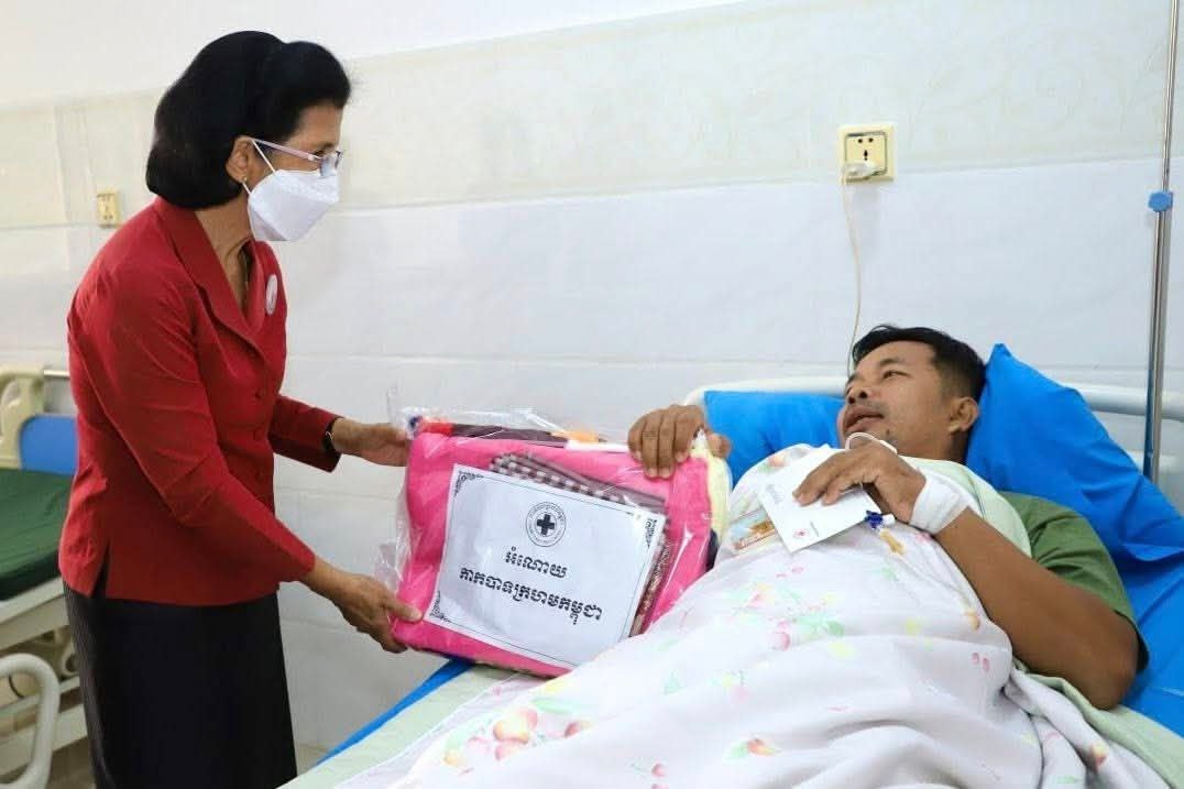 សម្តេចកិត្តិព្រឹទ្ធបណ្ឌិត ប៊ុន រ៉ានី ហ៊ុនសែន ប្រធានកាកបាទក្រហមកម្ពុជា នៅថ្ងៃទី២៣-២៤ ខែតុលា ឆ្នាំ២០២៥នេះ បានចាត់ឱ្យលោកជំទាវ ពុំ ចន្ទីនី អគ្គលេខាធិការ កាកបាទក្រហមកម្ពុជា និងសហការី អញ្ជើញនាំយកសម្ភារ-ភេសជ្ជៈ ព្រមទាំងថវិកាមួយចំនួន អញ្ជើញចុះសួរសុខទុក្ខយោធិនដែលកំពុងទទួលការព្យាបាល នៅតាមមន្ទីរពេទ្យក្នុងរាជធានីភ្នំពេញ រួមមានមន្ទីរពេទ្យកាល់ម៉ែត មន្ទីរពេទ្យព្រះកេតុមាលា មន្ទីរពេទ្យមិត្តភាពខ្មែរ-សូវៀត និងមន្ទីរពេទ្យមិត្តភាពកម្ពុជា-ចិន ព្រះកុសុមៈ ។
