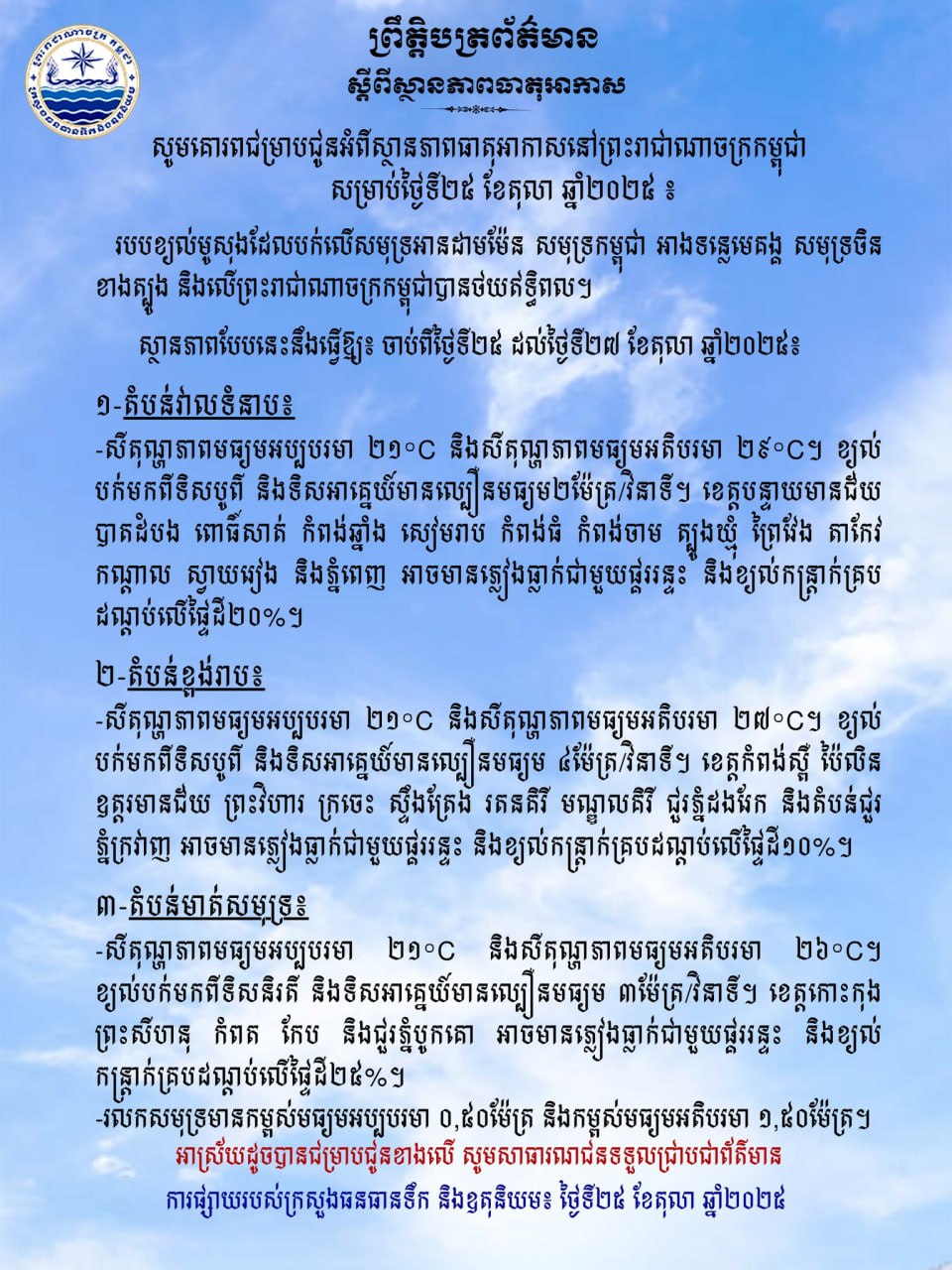 ក្រសួងធនធានទឹក ជូនដំណឹងអំពីស្ថានភាពធាតុអាកាសនៅកម្ពុជា សម្រាប់ថ្ងៃទី២៥ ខែតុលា ឆ្នាំ២០២៥