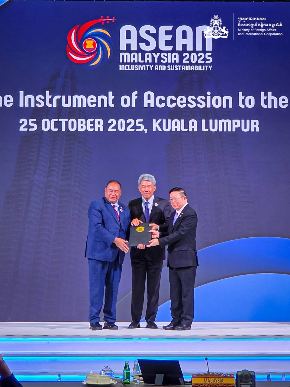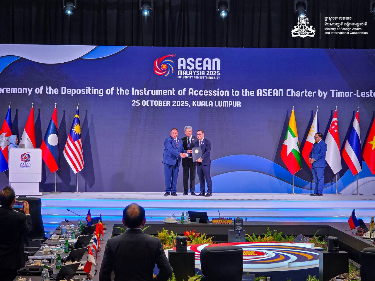 នៅថ្ងៃទី២៥ ខែតុលា ឆ្នាំ២០២៥ ឯកឧត្តមឧបនាយករដ្ឋមន្ត្រី ប្រាក់ សុខុន រដ្ឋមន្ត្រីការបរទេស និងសហប្រតិបត្តិការអន្តរជាតិ បានអញ្ជើញចូលរួមក្នុងពិធីតម្កល់លិខិតុបរកណ៍ ស្តីពីការចូលជាភាគីនៃសន្ធិសញ្ញាស្តីពីតំបន់អាស៊ី-អាគ្នេយ៍គ្មានអាវុធនុយក្លេអ៊ែរ និងការចូលជាភាគីនៃធម្មនុញ្ញអាស៊ានរបស់ទីម័រឡេស្តេ នៅទីក្រុងគូឡាឡាំពួ ប្រទេសម៉ាឡេស៊ី។