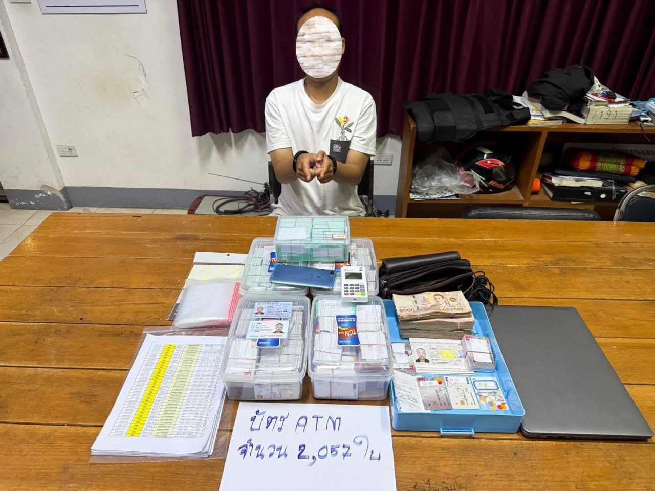 ខេត្តឆៀងរ៉ៃ ៖ ចាប់ខ្លួនជនជាតិចិនអាយុ ៣៥ ឆ្នាំម្នាក់ឈ្មោះ ហ៊ូ និងជនជាតិសៀម ម្នាក់ បន្ទាប់ពីរឹបអូសកាត ATM ចំនួន ២.០៥៧បន្ទះ ទូរស័ព្ទដៃពីរគ្រឿង កុំព្យូទ័រយួរដៃមួយគ្រឿង និងប្រាក់សុទ្ធចំនួន ៥៣៧.៩០០ បាត នៅផ្ទះរបស់គាត់។