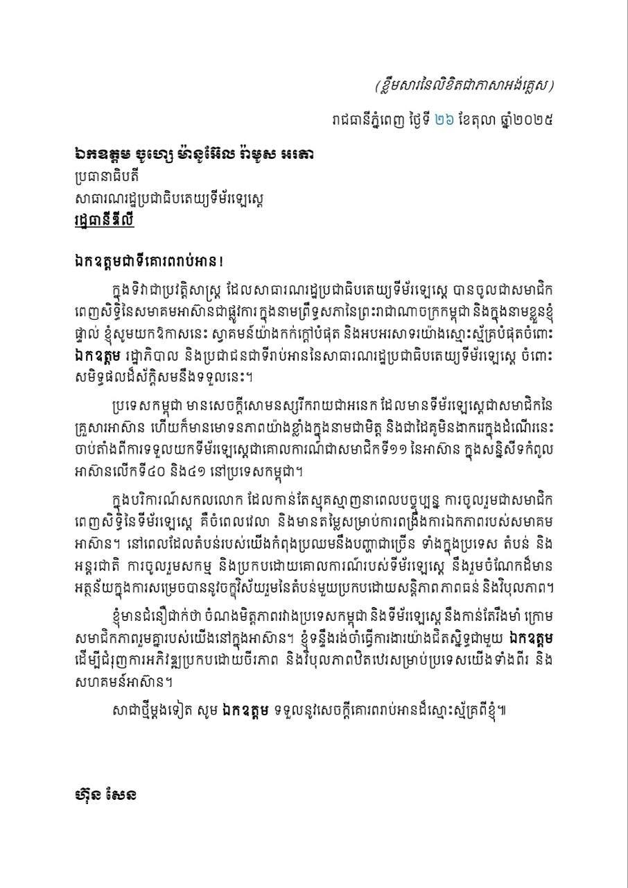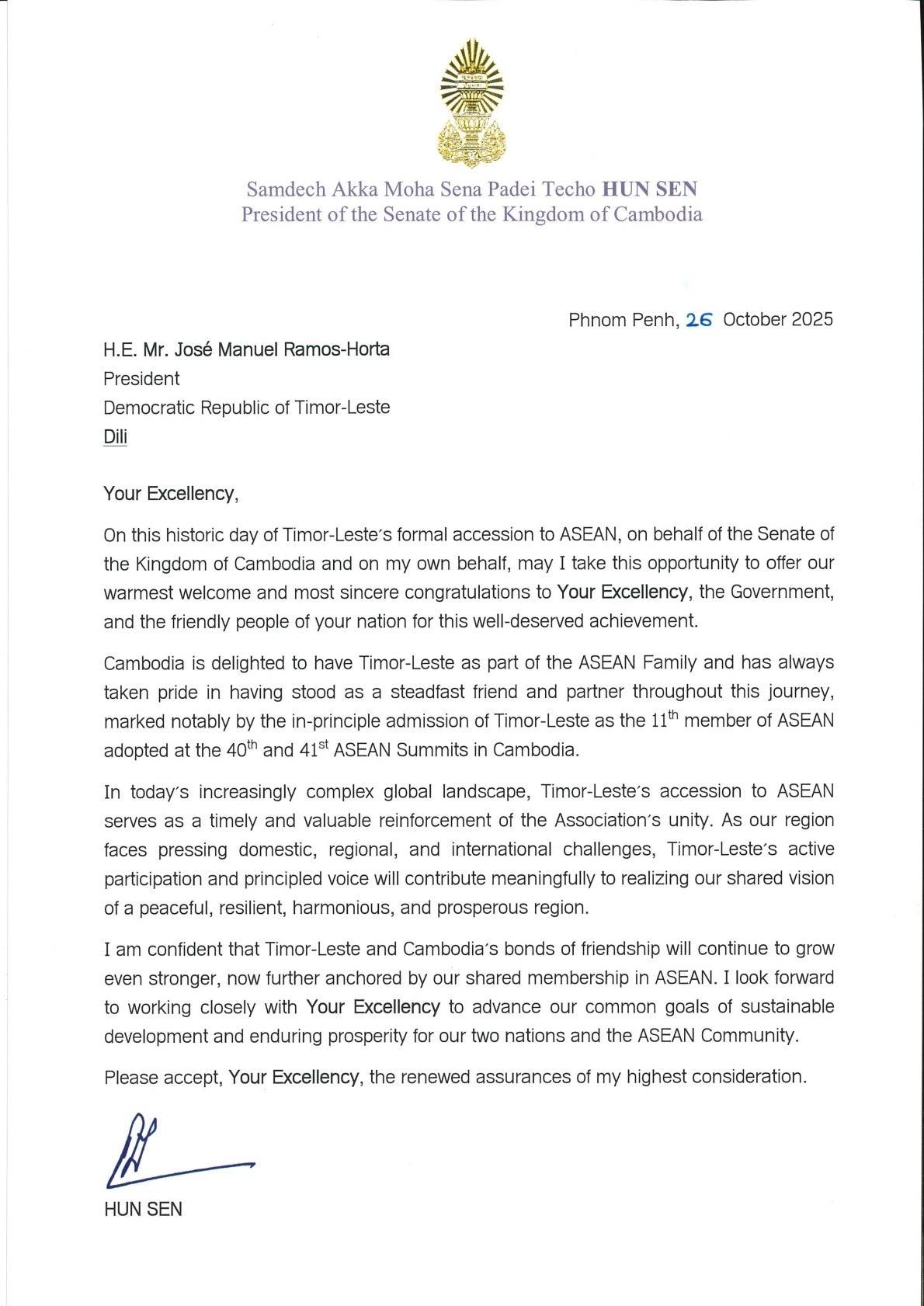 សម្តេចអគ្គមហាសេនាបតីតេជោ ហ៊ុន សែនប្រធានព្រឹទ្ធសភា នៃព្រះរាជាណាចក្រកម្ពុជា ផ្ញើសារលិខិតអបអរសាទរ ជូន ឯកឧត្តម ចូហ្សេ ម៉ានូអ៊ែល រ៉ាមូស អរតា ប្រធានាធិបតីសាធារណរដ្ឋប្រជាធិបតេយ្យទីម័រខាងកើត ក្នុងទិវាជាប្រវត្តិសាស្រ្ត ដែលទីម័រខាងកើត បានចូលជាសមាជិកពេញសិទ្ធិនៃសមាគមអាស៊ានជាផ្លូវការ