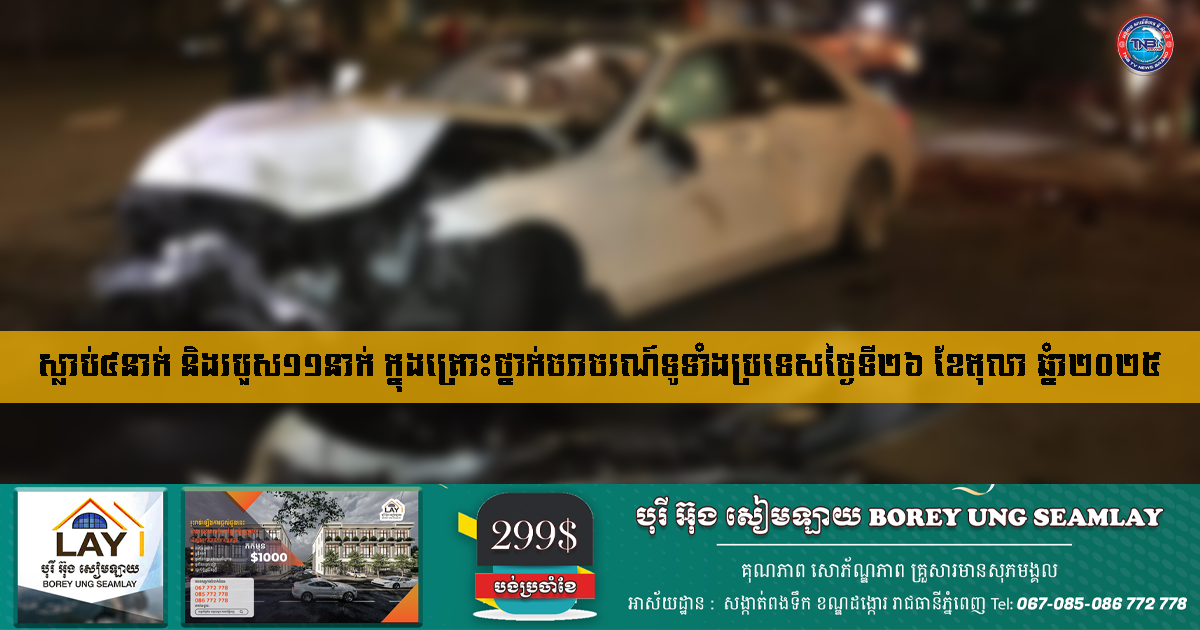 ស្លាប់៤នាក់ និងរបួស១១នាក់ ក្នុងគ្រោះថ្នាក់ចរាចរណ៍ទូទាំងប្រទេសថ្ងៃទី២៦ ខែតុលា ឆ្នំា២០២៥